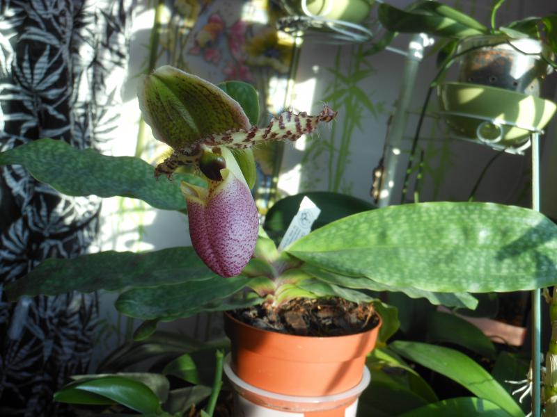 Сегодня у нас немного солнышка было и вот успела сфотографировать Paph.Pinocchio MS, поставщик Whichman, одна розетка, но листья довольно разлапистые.