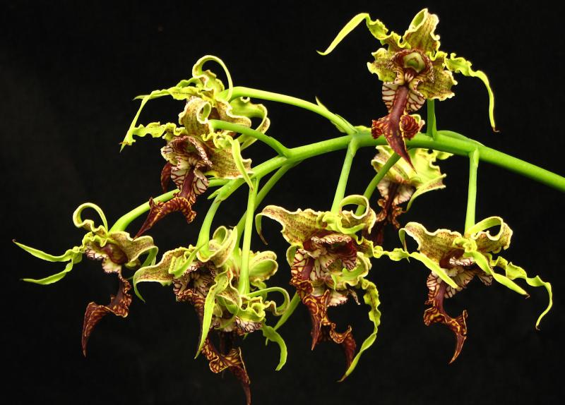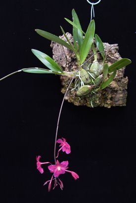 В качестве места дислокации растения идеально подойдут ЮЖНЫЕ, ЮГО-ЗАПАДНЫЕ и ЗАПАДНЫЕ ОКНА. Без обгорания (политая) орхидея может переносить прямое полуденное солнце в 50.000-70.000 Люкс, приобретая более светлый оттенок листьев и псевдобульб, тёмные окрасы могут краснеть. Солнечный свет должен быть не просто ярким, но и ПОСТОЯННЫМ, т.е. и весной, и летом, и осенью, и зимой, что существенно осложняет содержание данного растения в наших широтах, где интенсивность освещения очень низкая зимой. Выходом из ситуации служит установка над растениями ламп искусственного света - ФИТОЛАМП [подробнее об освещении орхидей ...], на период с конца сентября и до апреля. Общая продолжительность светового дня должна быть не менее 12-16 часов, иначе орхидея может просто-напросто не цвести.