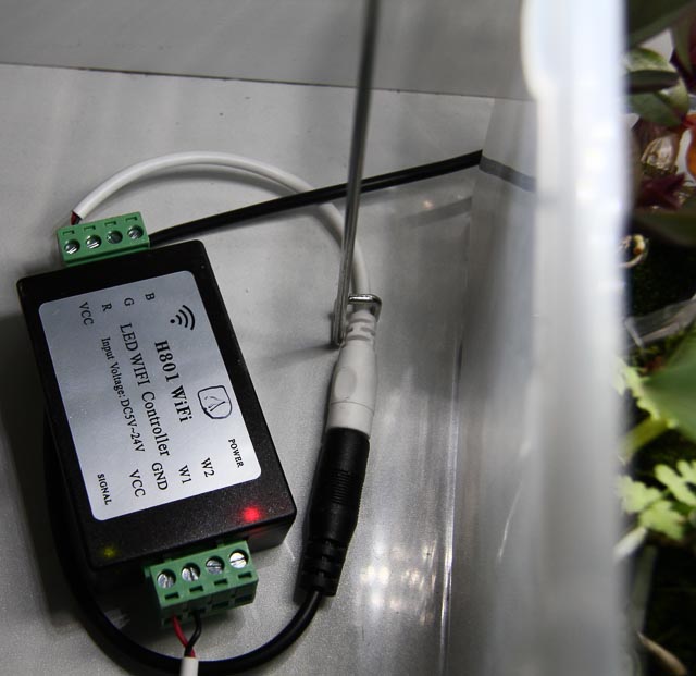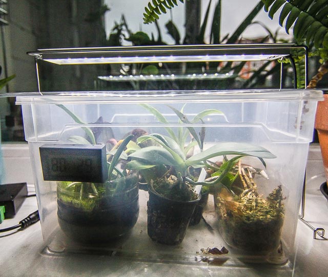 Сделаны из стандартной икеевской прозрачной пластиковой коробки. Крышка сверху не штатная, а кусок прозрачного пластика от какой-то икеевской же упаковки. Сверху установлена подсветка из лампы для аквариума, раньше просто лежали светодиодные линейки. Кушает это примерно 10 ватт, освещенность дает в диапазоне 15-45клюкс в зависимости от высоты листвы. Полив где-то раз в неделю или чуточку реже, контроль необходимости полива - по показаниям гигрометра, как влажность падает ниже 75%, надо поливать. Какое-то время назад даже настроил оповещение на телефон-планшет, но сейчас это не работает, т.к. сенсор пришлось перевести на другую работу.