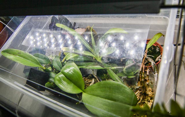 В левом верхнем углу дендробиум, по фиолетовому оттенку листьев видно, что для него это почти максимальный уровень яркости. Справа торчат листья морковки Monnierara Black Magic, ей, конечно, маловато будет. И сыровато ей тоже - листья в пупырышек, но в целом массу наращивает.