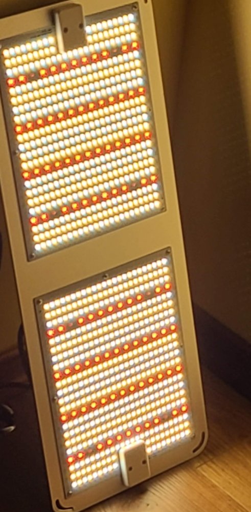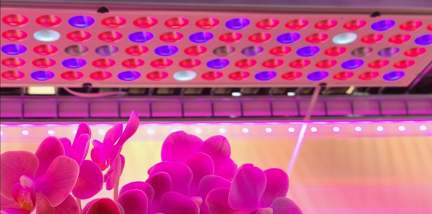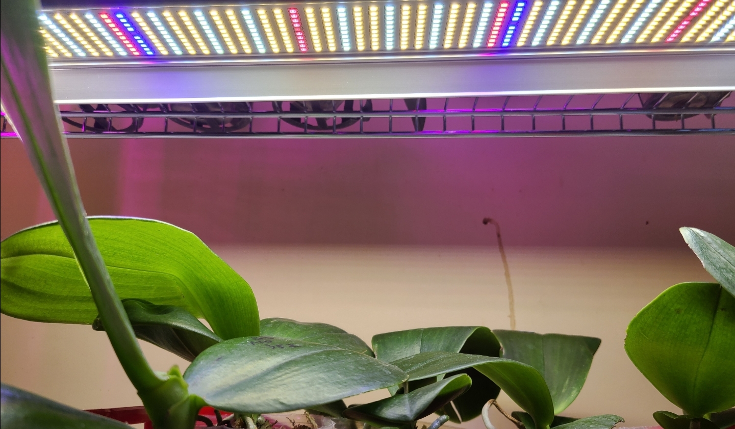 Для цветения такой, свет не яркий но дает пигментацию из за повышенного УФ и ИФК. Он дает розовый цвет, на первом фото как раз тень от этого источника.