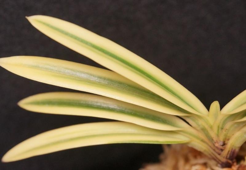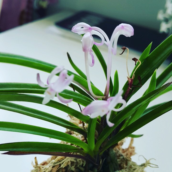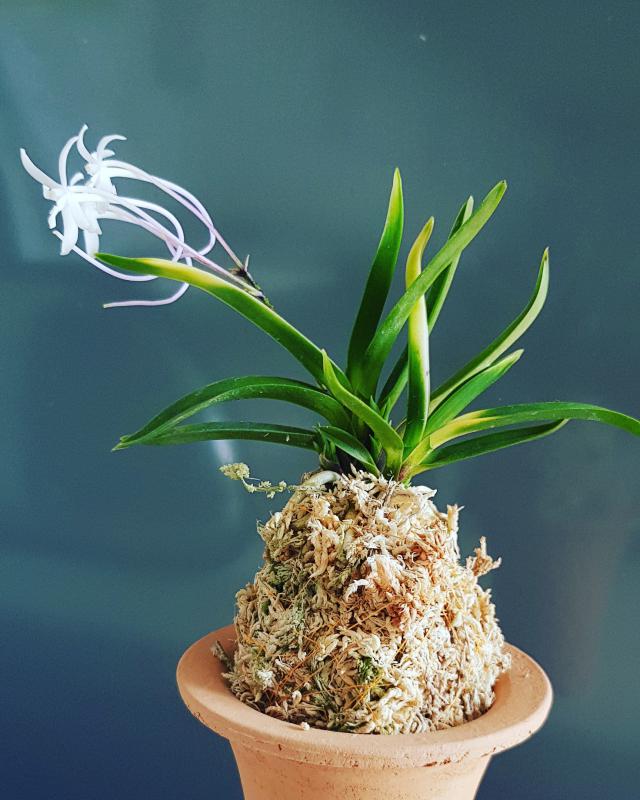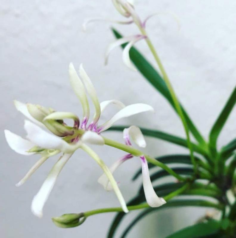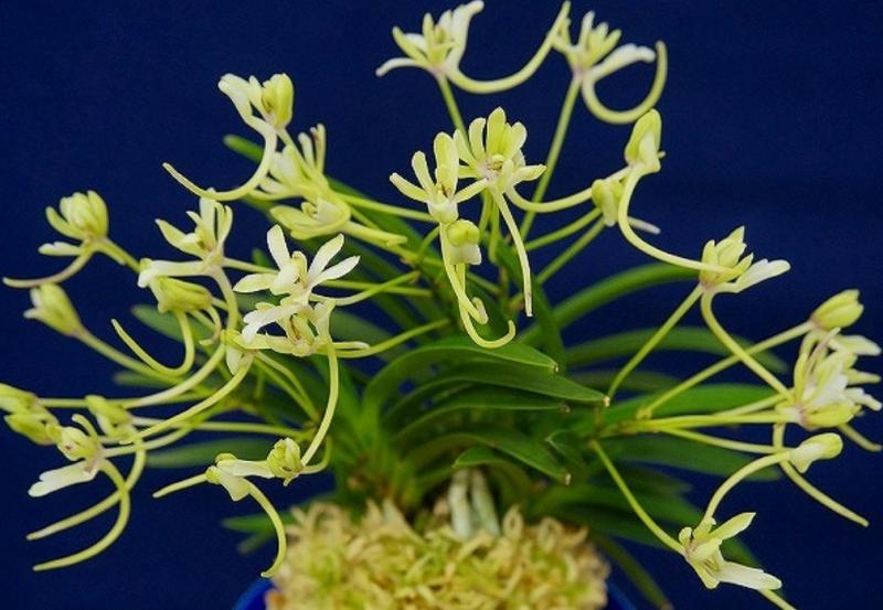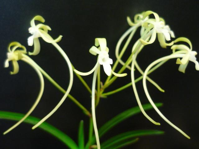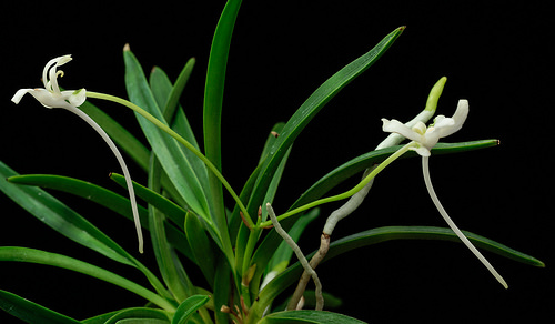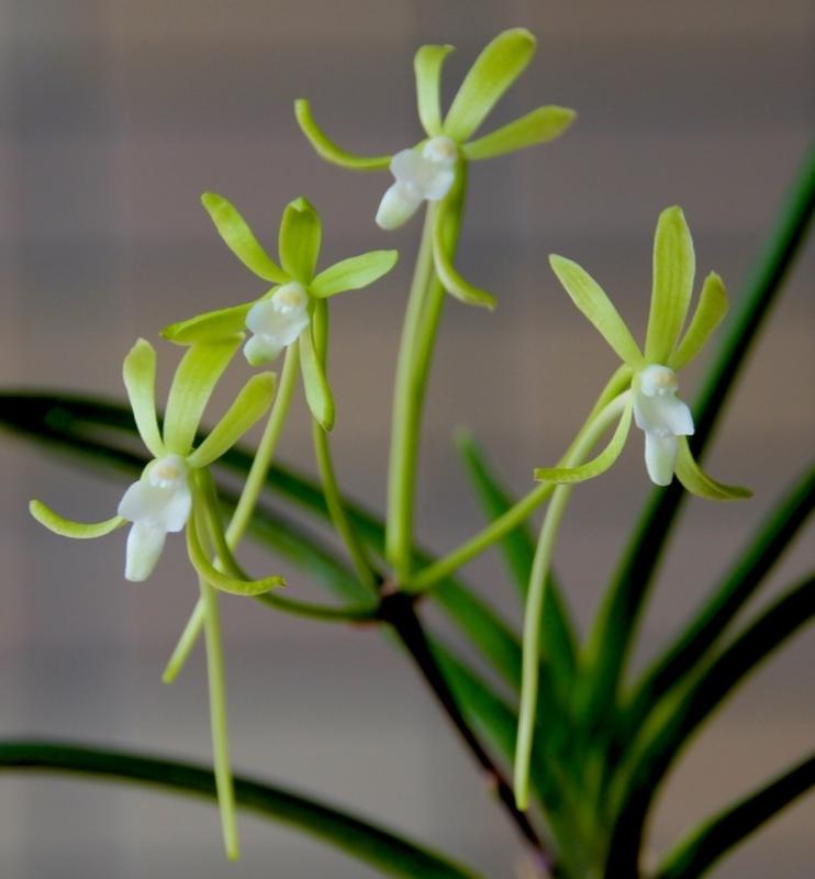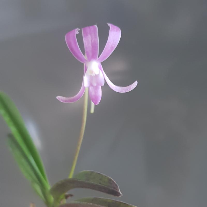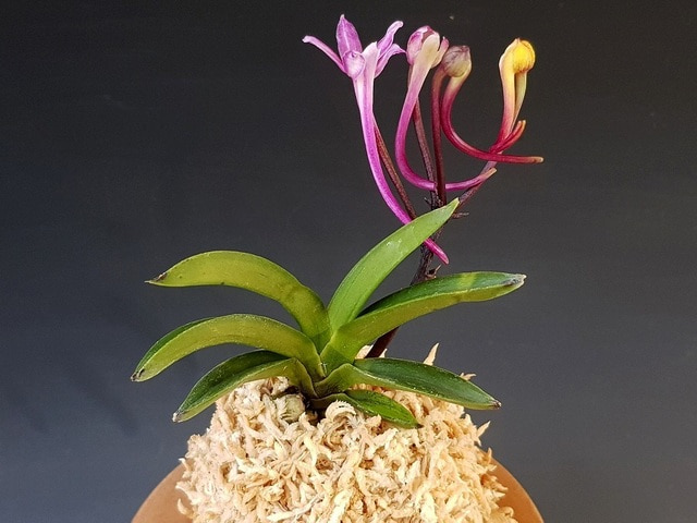 Hanamatoi Это редкое растение ценится за свой необычный цветок, который имеет три шпорца. Растение с тонкими листьями, коричневого цвета ствол и корни. Место соединения листа со стволом в форме месяца.