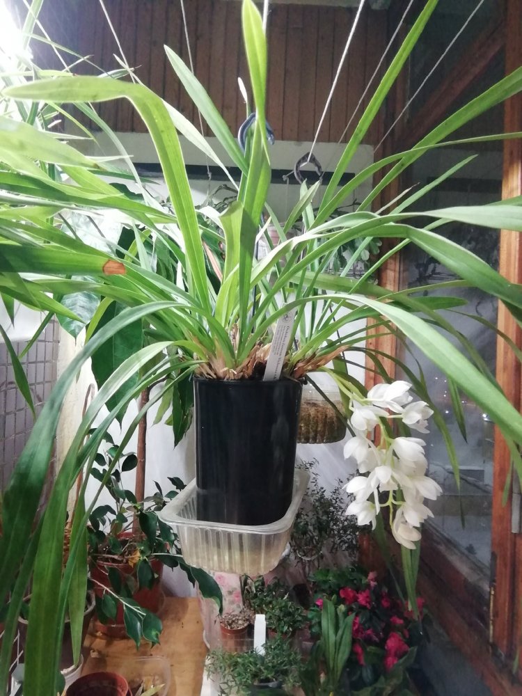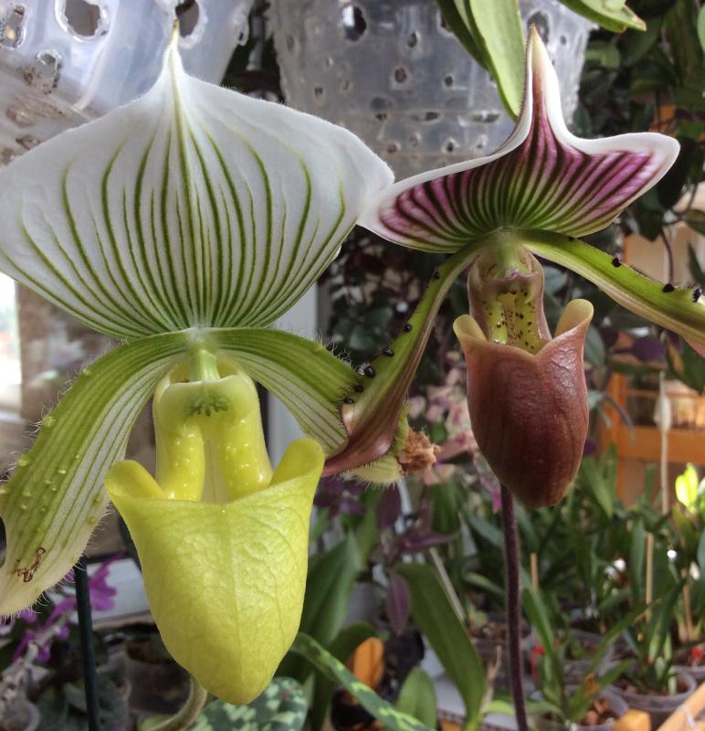 Это очень крупный пафиопедилум, в размахе розетка 50 см. А вот он со своим земляком, с отцветающим paph. Clair de Lune 'Edgard Van Belle'.