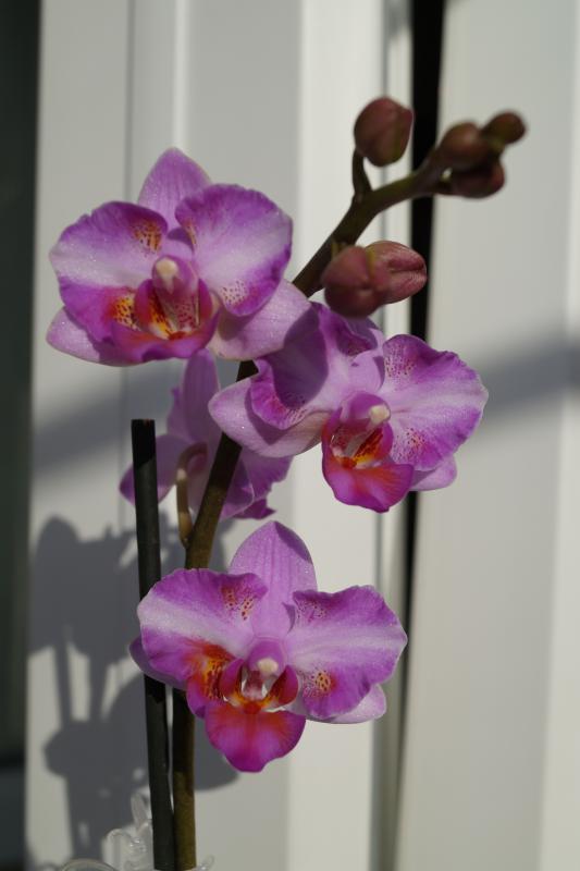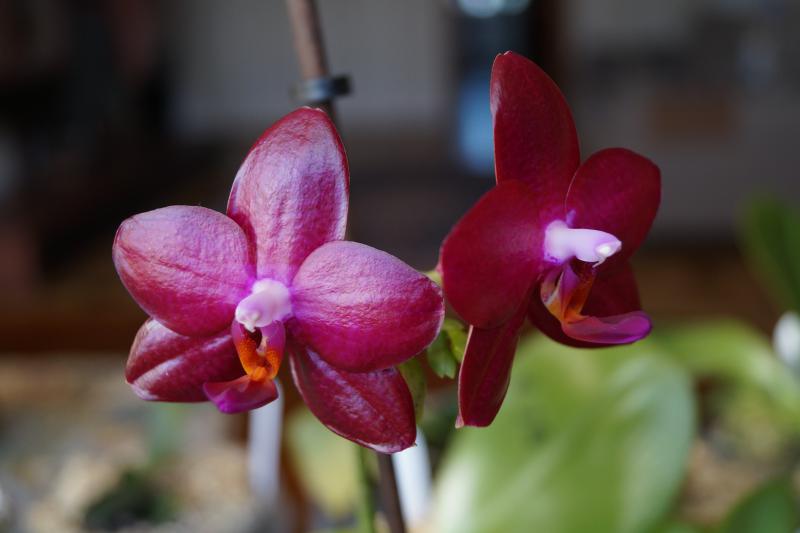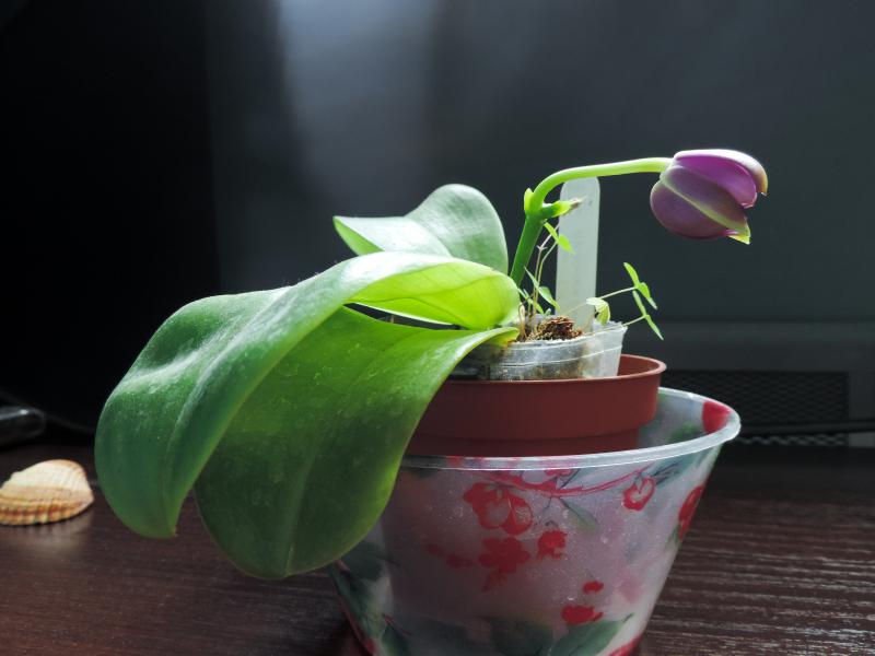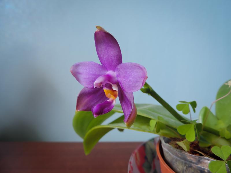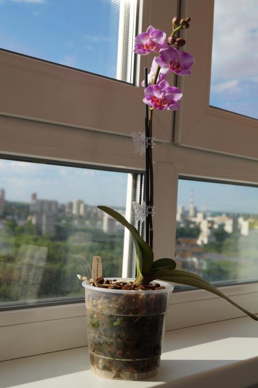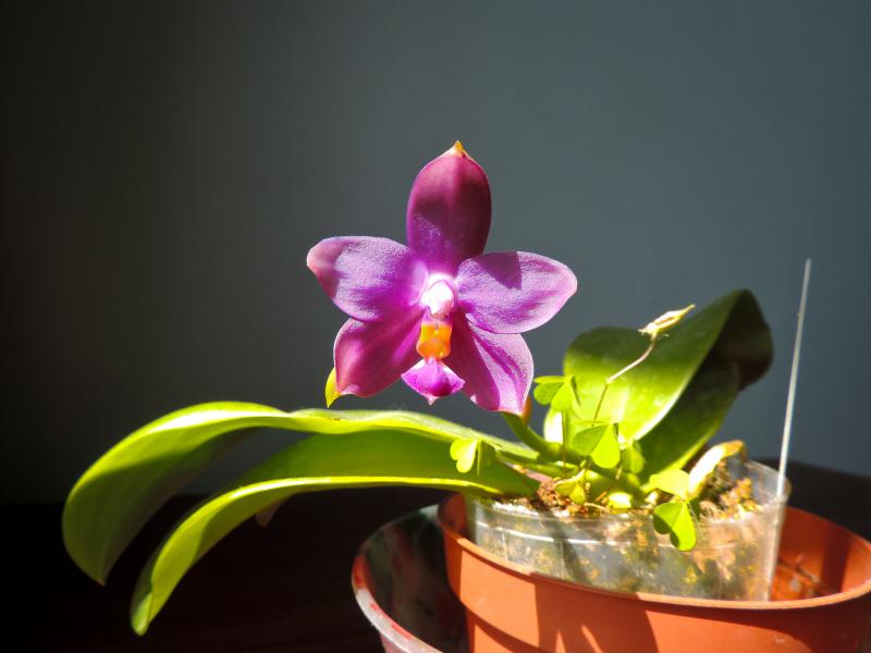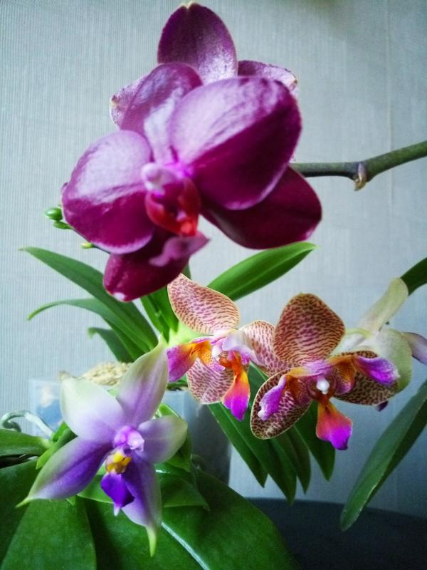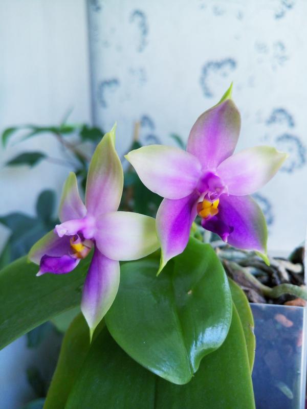 Цветение на бульбе, выросшей исключительно под искусственным светодиодным освещением на стеллаже, первый цветок раскрылся там же, второй - на даче. Цветы с атласным переливом, который, к сожалению, на фотографии передать не удаётся.