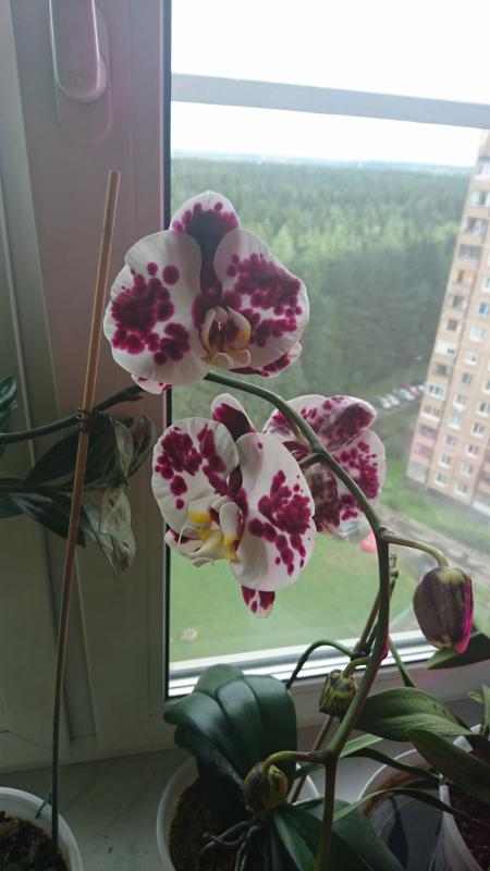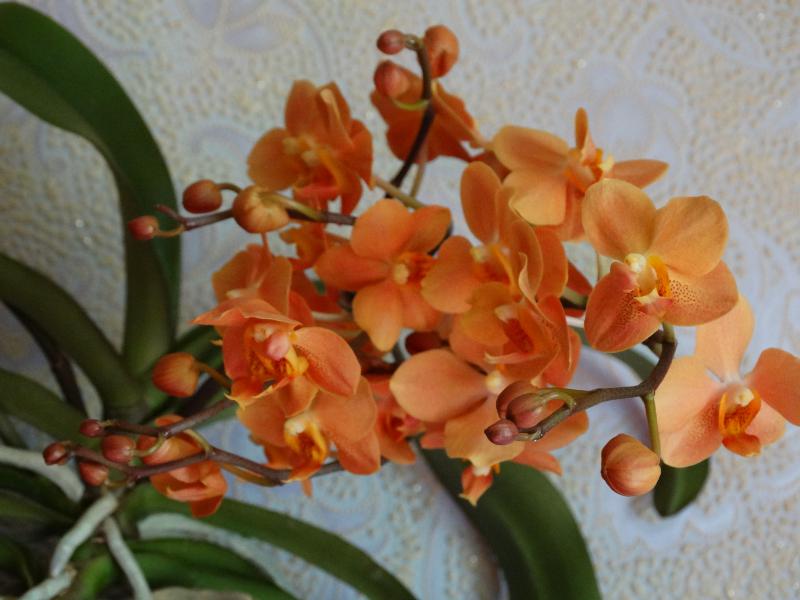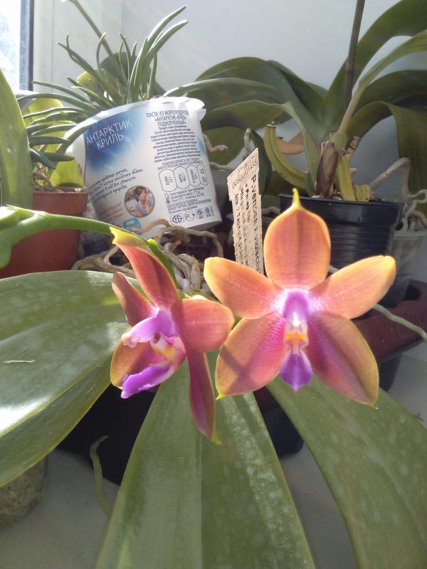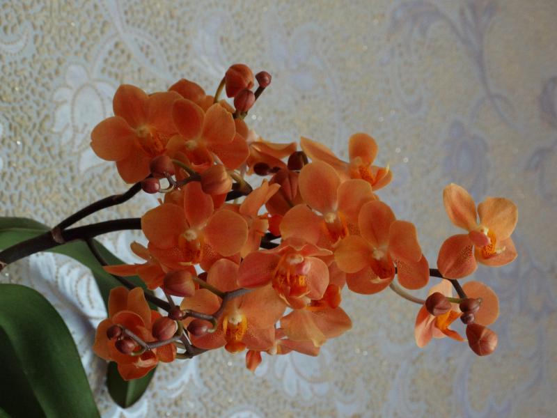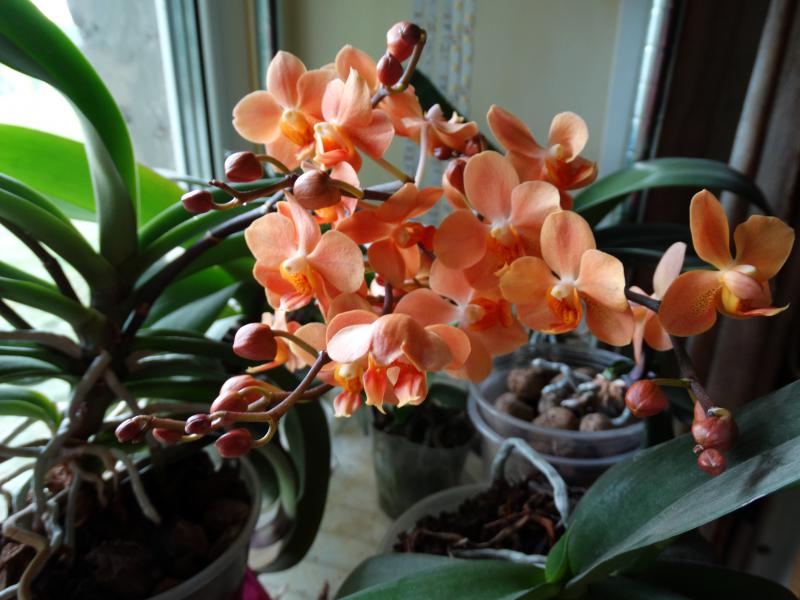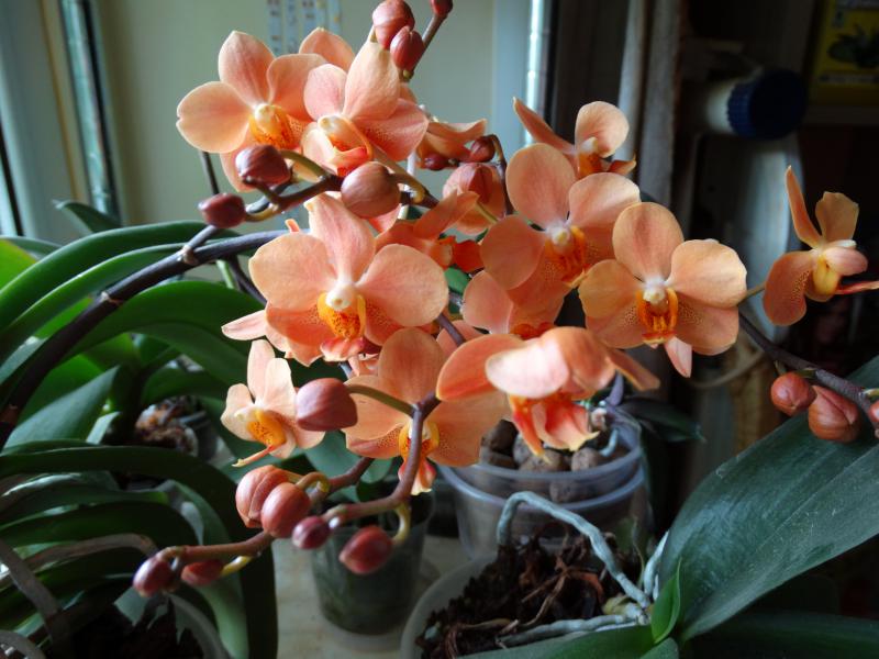 Зацвела полученная в феврале 2016г от Mikiorchid Ascps.Irene Dobkin\'Elmhurst\'HCC/AOS,получена была взрослой с множеством срезанных цветоносов ,в хорошем состоянии,но по приходу разболелась и сподобилась на цветение только сейчас ,всего выдала 3 цветоноса ,цветет пока с одного так что любоваться этим рыжим облаком надеюсь долго буду.Еще я еще не разу не видела таких закрученных цветоносов и столько мутированных цветов ,кормлю редко так что этот вариант отпадает ,но все равно красотка. Вот несколько ее фото
