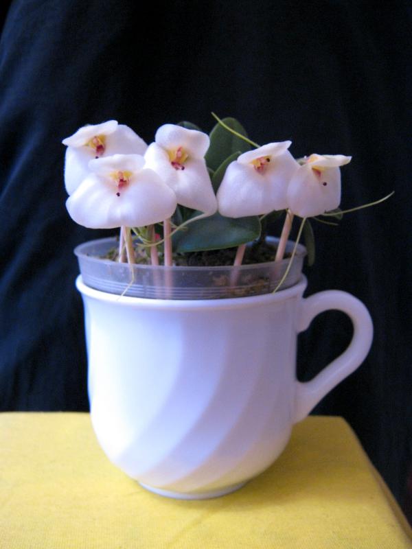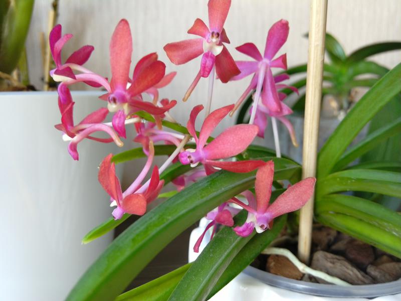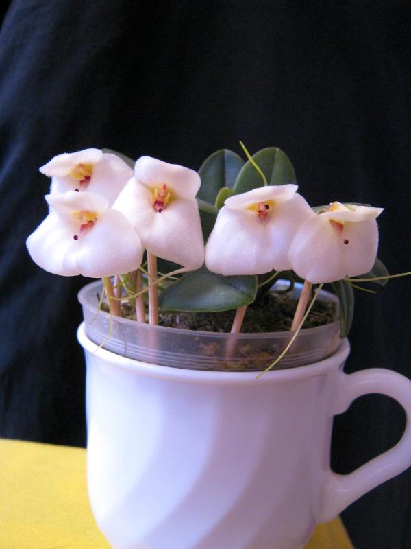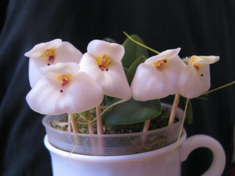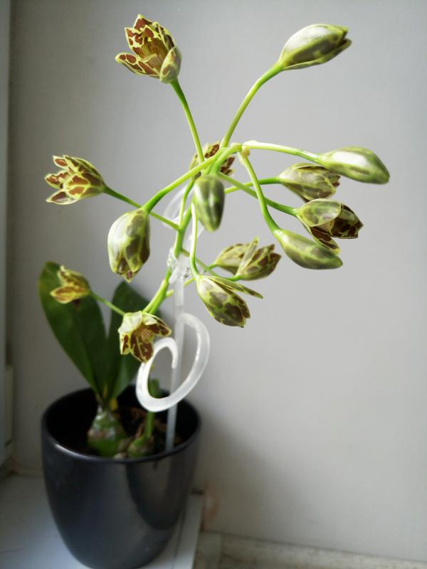 Зацвела клубневая орхидея Habenaria carnea. В прошлом году она досталась мне в плачевном состоянии, т.к. по незнанию предыдущий владелец содержал ее в ... мокром сфагнуме. И даже не смотря на пересадку в нормальный грунт растению не хватило сил зацвести (отрастила цветонос, надула бутоны и потом они благополучно засохли вместе с ростком и клубень ушел на покой). Клубень отзимовал в сухую на подоконнике, высадил по весне в свежий грунт и вот результат
