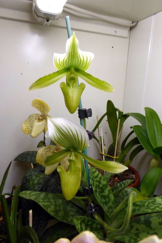 В общем вот так это у меня и выглядит. Больше места для размещения орхидей нет никакого, кроме одного тёмного подоконника (северо-западное окно, первый этаж). Поэтому башмаков не много и они все относятся к категории "проще не бывает".