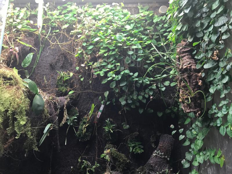 Проблема в том, что это старое фото, ему где-то года два. Это влажный режим (пролив фона 1 раз в день по часу + 5 раз в день дождевание по 10 секунд + туман один раз на полчаса). Так вот, проблема как в том анекдоте, где мужик ходил по рынку с медведем и искал, кто ему хомячка продал. Маленький с ладошку спатефиллум (на переднем плане. Кстати, он вообще в воде растет) вымахал в полуметровое чудовище. Неорегелия мейендорфа (слева) заполонила четверть ширины. Но хуже всего дело было с аллоказией клипеолятой - она из десятисантиметрового стрючка вымахала больше метра. Более того, накидала везде своих шишек. Растения уже нет, а ее шишки все прорастают и прорастают. Кстати, никому не надо? В общем, меня это все задолбало, да и времени нет на влажный вивариум. Поэтому я решил перейти к орхидеям. Для этого я продрал все жестко, выдрал все, что крупнее ладони и начал его сушить. Сейчас режим полива: раз в неделю пролив фона на час + два раза в день дождевание по 15 секунд. Пока временное размещение всего, т.к. я размышляю, как мне сделать возможность опускать температуру до 15 градусов. Там на фото видны разложенные термометры в разных зонах. Я слежу, где и что с температурой происходит. Да и еще нужны кое-какие коррективы с движением воздуха.