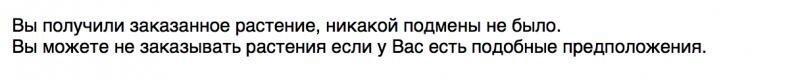 Исполнением заказа в части логистики удовлетворен, фактом наличия заказанного растения - отзыв отрицательный, по состоянию растения - отзыв отрицательный. Общая оценка - отрицательная.