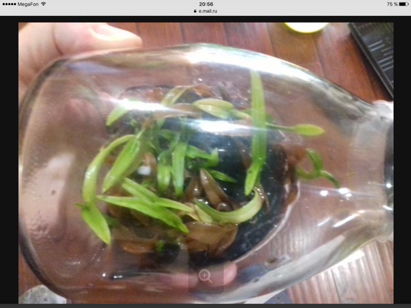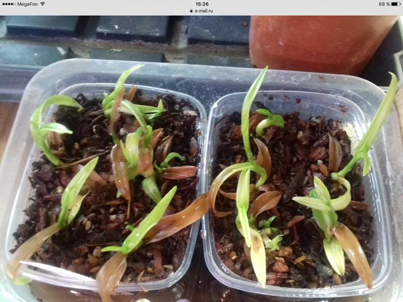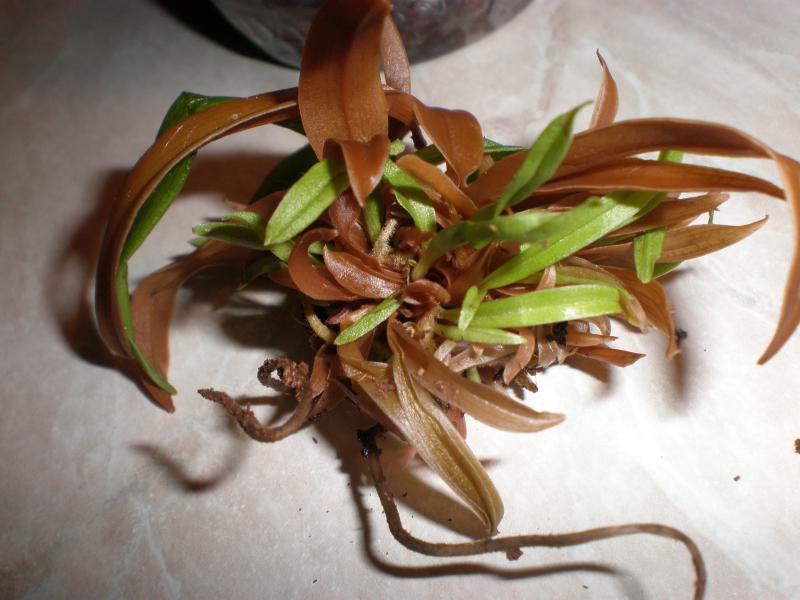 Галина, коричневые листья пока можно не трогать, если не начтут плесневеть, гнить. Не знаю, что с ними произошло, но на сегодня они не гнилые (хотя выглядят таковыми). В пазухах этих листьев уже есть крошечные новые росты, которые начинают сейчас расти. Из требований к уходу - высокая влажность воздуха при постоянном движении (соответсвенно, не теплица); полив только чистейшей (без солей) водой (дождевая, талая, из под осмоса, либо бутилированная); обязательно на сегодня тепло и без сквозняков. По свету - те, кто выращивает именно фраги ковачи давно, рекомендуют для малышей не сильное освещение (взрослые требуют много света, примерно как каттлеи). Я свой поставила под хорошее освещение под лампу (и фласку тоже). Потому что считаю, что в таком критическом состоянии нужно много света для хорошего фотосинтеза. Так, опять же на мой взгляд, у них будет больше шансов не помереть прямо сейчас.