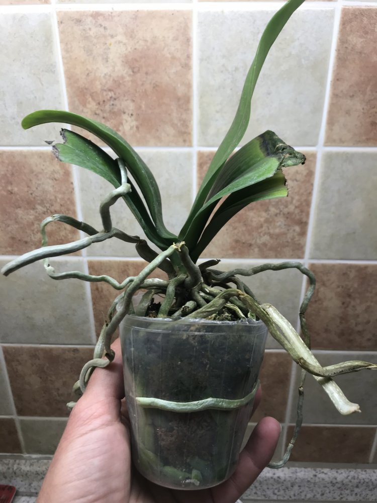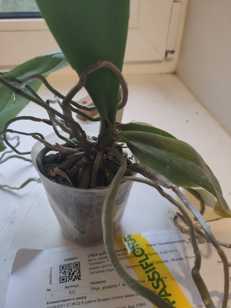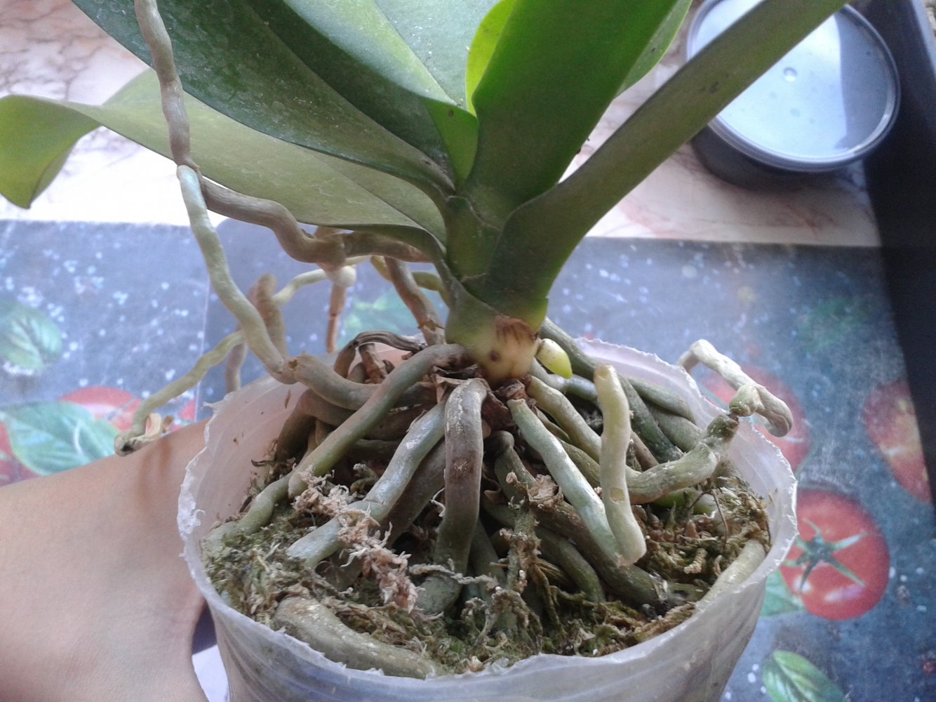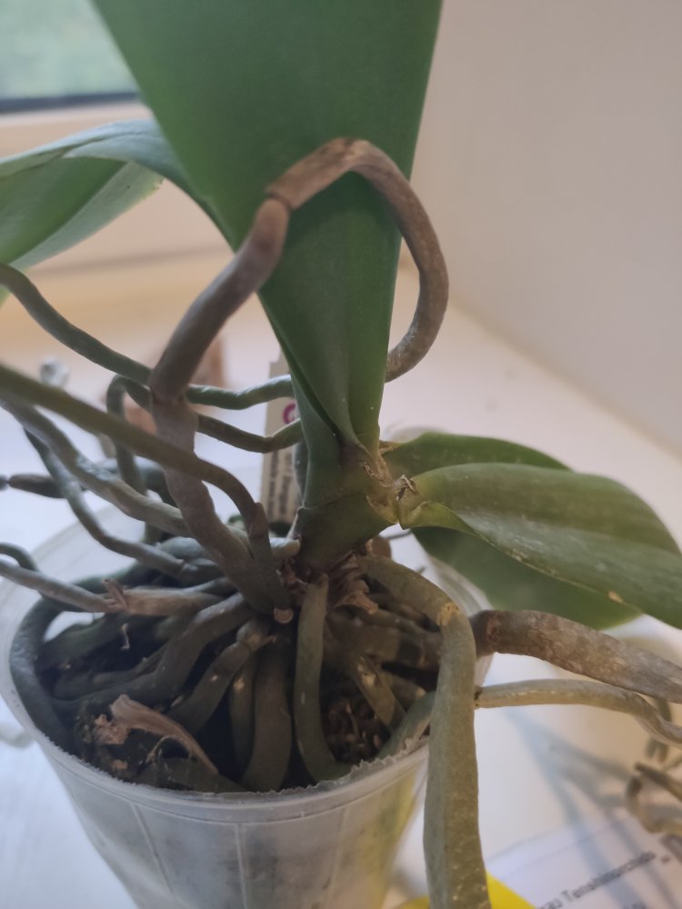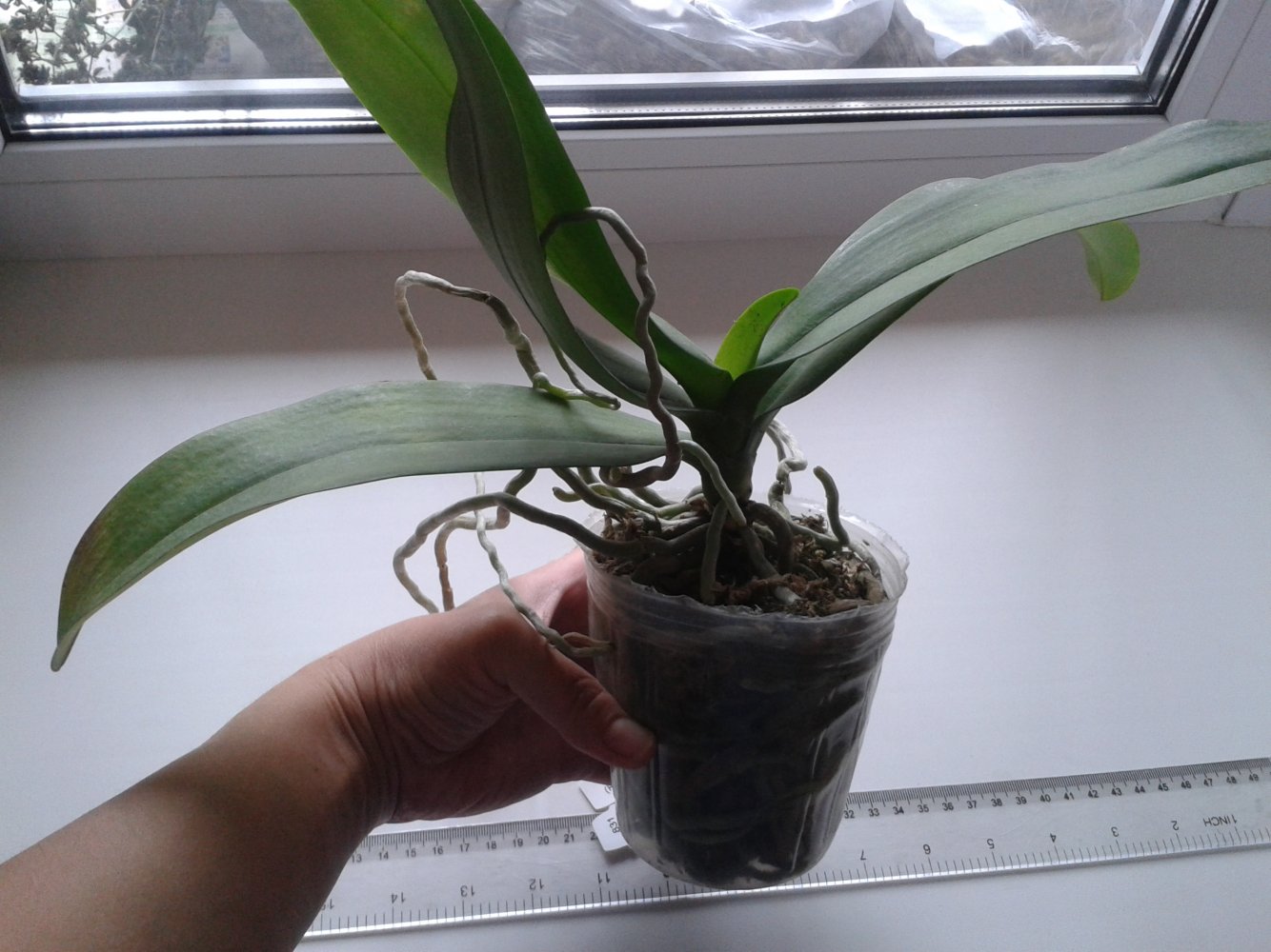 Растение взрослое, куча корней и засохший цветонос. Правда отвалилось два листа, по непонятным причинам. Гнили