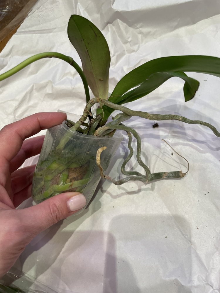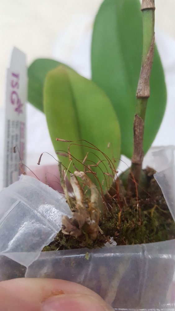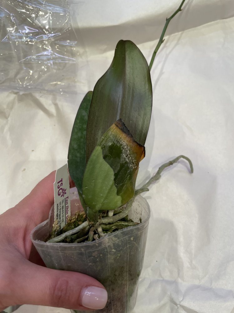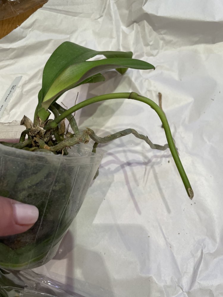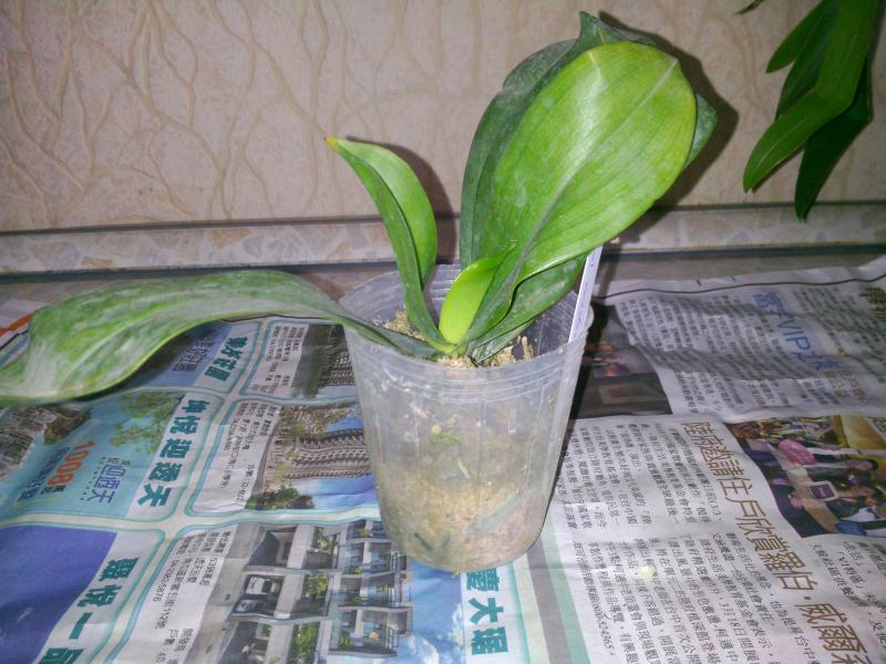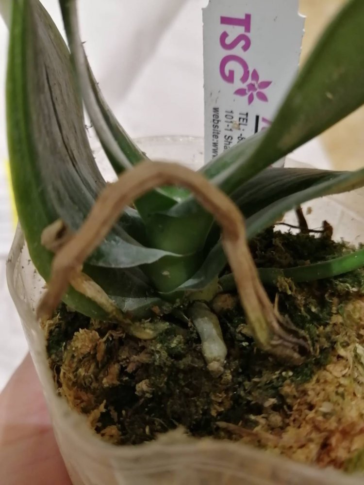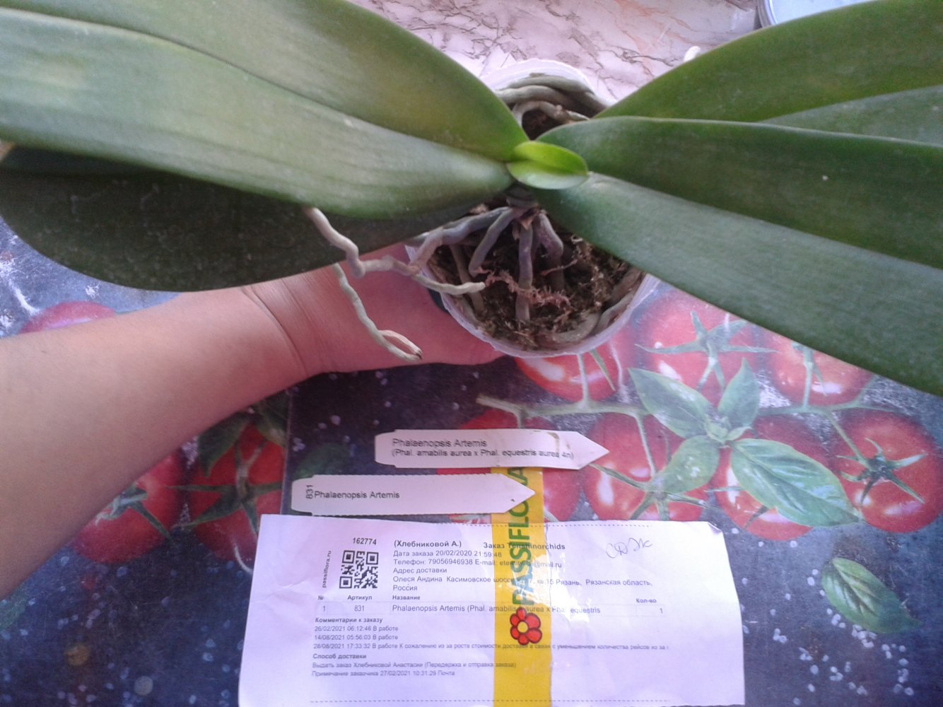 Растение взрослое, куча корней и засохший цветонос. Правда отвалилось два листа, по непонятным причинам. Гнили