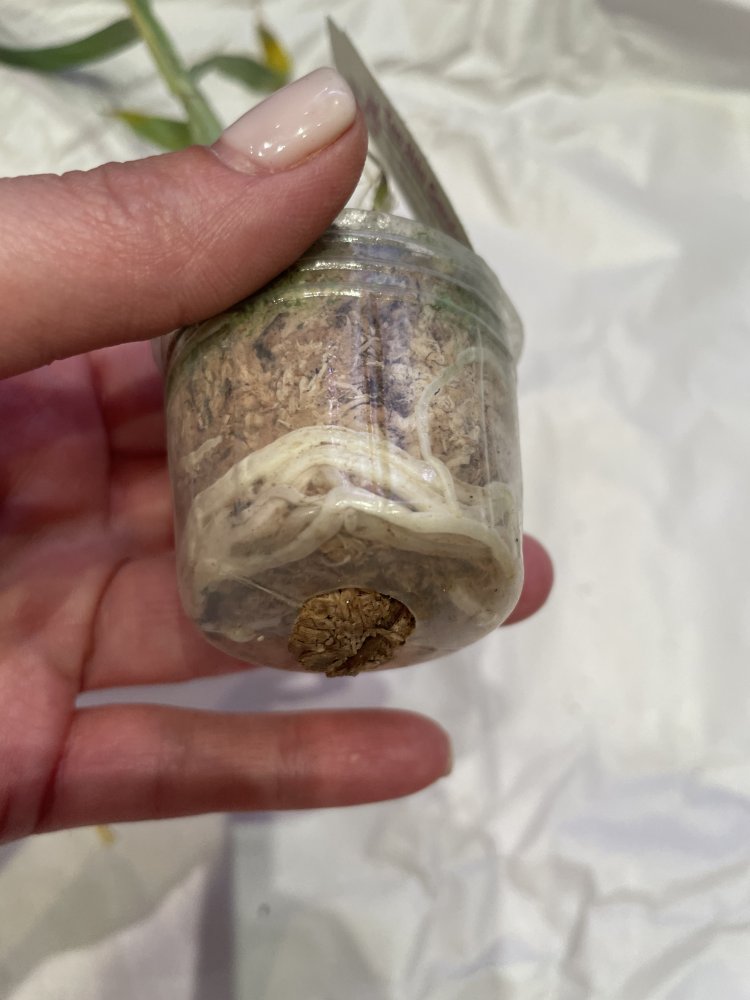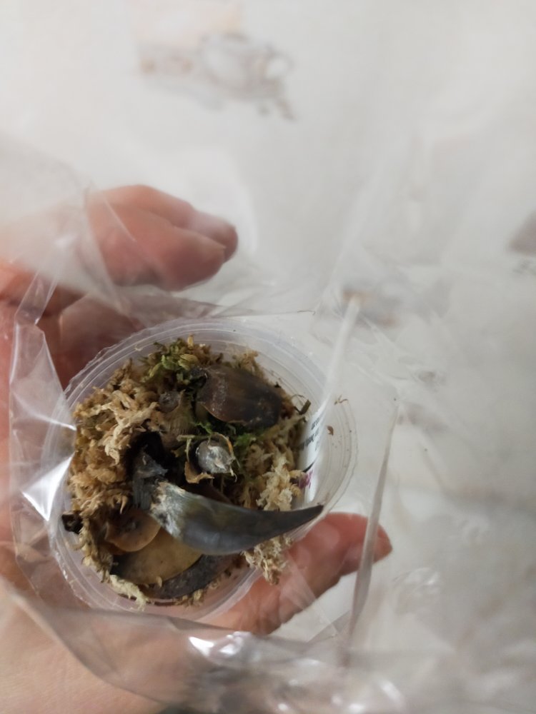 Отсутствие корней (в сухом, практически зацементированном мхе, к сожалению, нашла только солому) и коричневые пятна на прошлогодних бульбах внушают опасение.