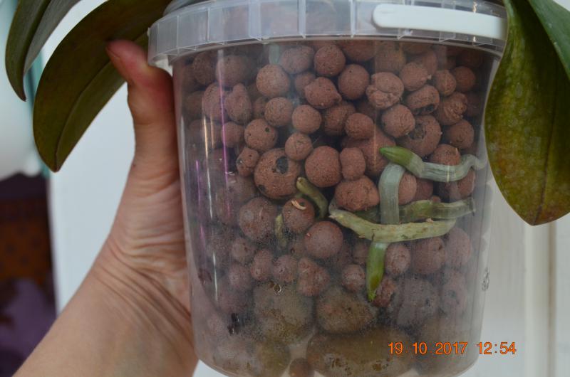 Горшок нужно брать по корневой, я никакие корни не отрезаю, снимаю только то, само снимается. В керамзите точно также просыхает как в коре. Сейчас я мало воды наливаю чуть-чуть на дно, и просушки бывают,смотрю по состоянию. Я пересаживаю и с цветоносами, ничего им не делается. У меня там с другой стороны есть старые плохие корни, но новые очень быстро выросли, заметить не успела.)интересно, а если я своего из коры в керамзит пересажу, что будет? Веломен придется со многих корней снять, высох. Гнить не начнут остатки из-за того, что не будут справляться с влажностью керамзита? Может надо взять совсем небольшой горшок?