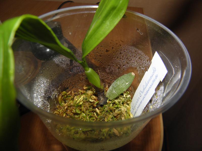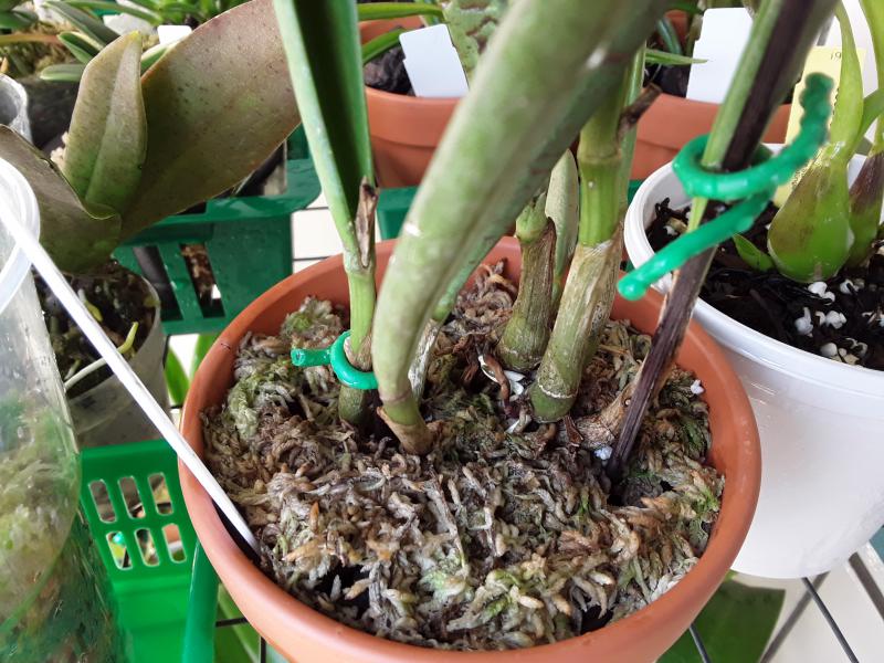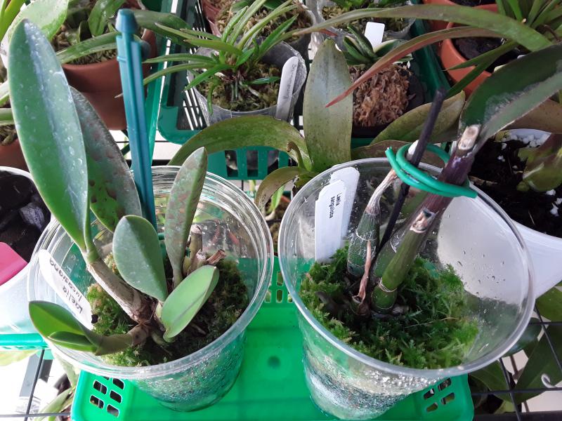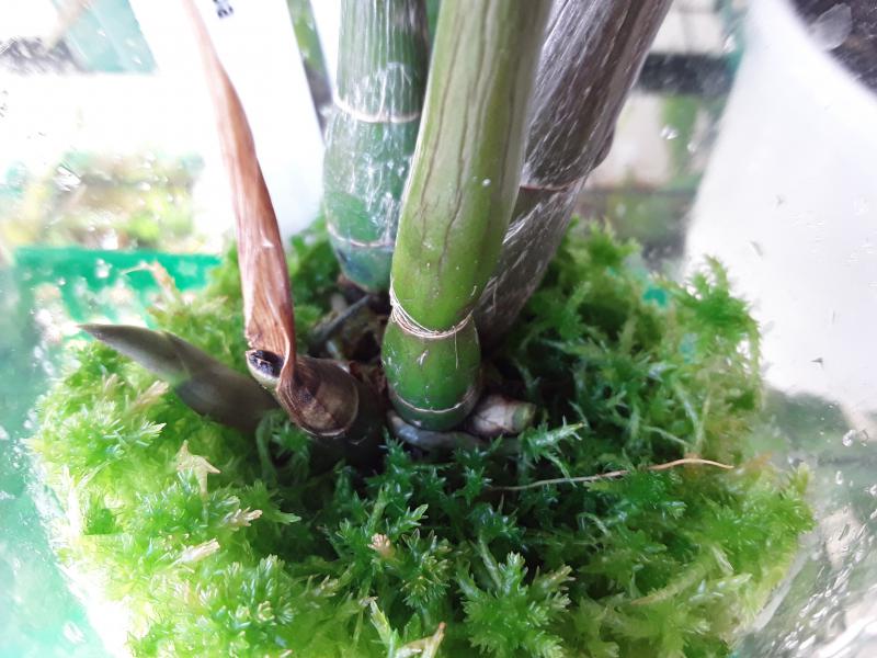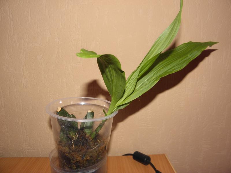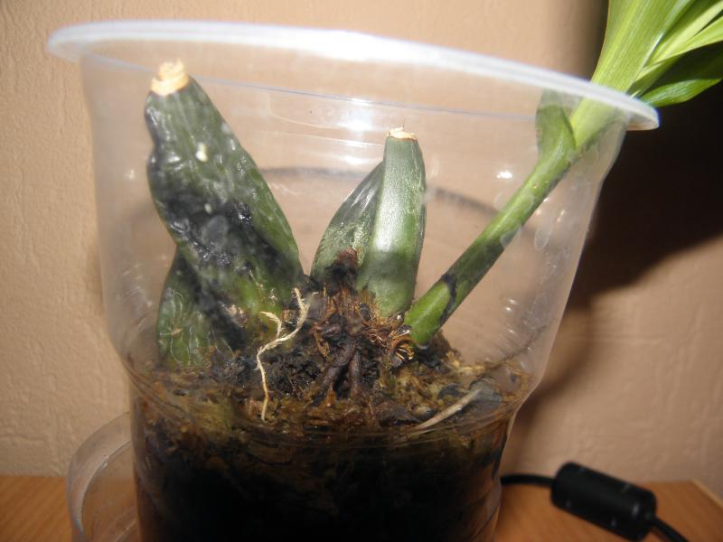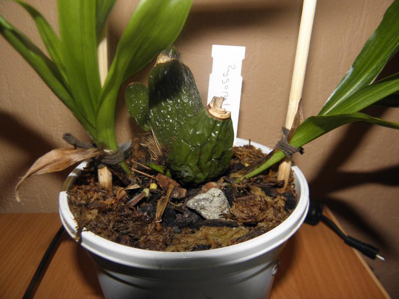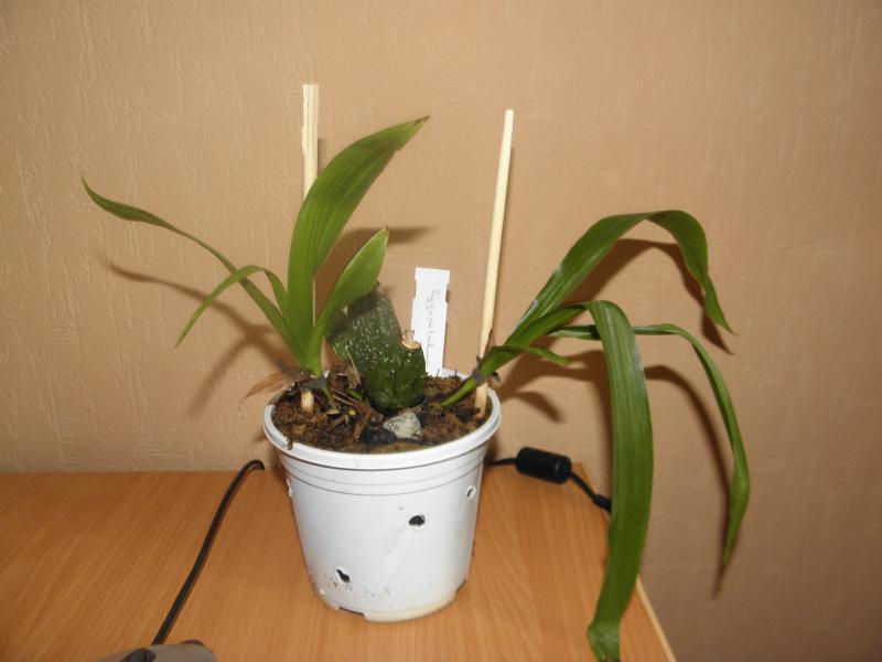 Вторая лели была куплена в то же время на выставке от Эквадора, деленка меньше, но примерно в таком же состоянии, без корней. Сначала посадила ее в мох (не в тепличку) и поставила под лампу. Она начала молниеносно поедать себя. За пару недель потеряла почти все старые бульбы, осталась с одним листом. Поэтому срочно была также посажена в тепличку на мох. Процесс поедания еще какое то время продолжался, но уже медленнее. Вскоре и она стала восстаналявать тургор и выдала новые росты. На фото видно, что верхушки бульб засохшие - по мере съедания они отсыхали. Вывод - посадила бы ее так сразу, сохранила бы большую часть зеленой массы....