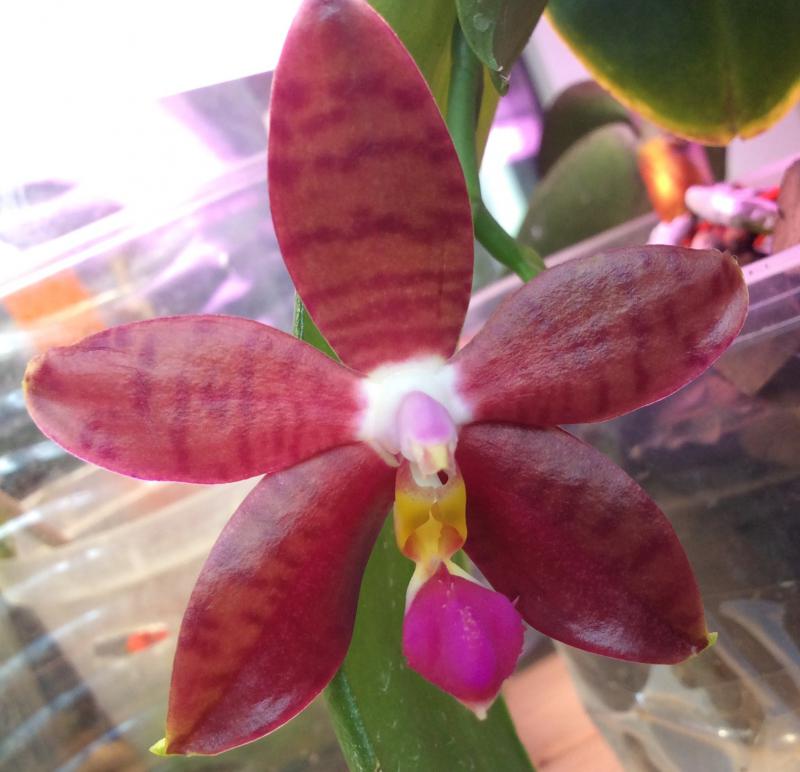 . Спасибо ...Да, похож... но вот про нарастающий цветонос я не уверена, что будет...цветонос довольно длинный уже, не такой как у новелти... все же коктейль из родителей у него немного другой (сильно разбавленный), но я надеюсь на многоцветковость и дальнейшее увеличение размера цветкашикарный, но мне очень напоминает Phal. HO's Lovely Amethyst тоже весь переливающийся, очень ароматный. Очень его люблю, еще и цветонос наростающий