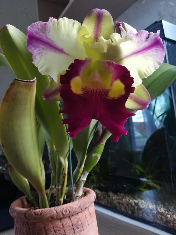 Покупалась на этом ресурсе два года назад, от Mikiorchid. Пришла без корней, опыта с каттлеями на тот момент было "минус ноль", мысленно списала в покойники и поставила в пустой горшок, поливать там было нечего. Постепенно как-то пошел рост корешков, перевела в мох. В прошлом году созревшая бульба продинамила с цветением. Стала читать Сами-знаете-кого (кто не знает - г-жу Ляпину), и чуть не уморила только оклемавшуюся растень. Плюнула на советы, сказала "не процветешь - продам!", и выставила в конце апреля на улицу с уже большим ростом (почти бульба) вместе с еще тремя каттлеями. В мае, сгорая от нетерпения и любопытства, раздвигала лист в надежде увидеть чехол. Фигушки, нет у нее чехла!