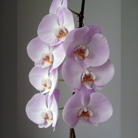 В марте они завяли, и уже в мае моя труженица снова представила нежно-розовые блюдца. На новом цветоносе распустилось восемь крупных цветков, размер которых превышал 10 см.