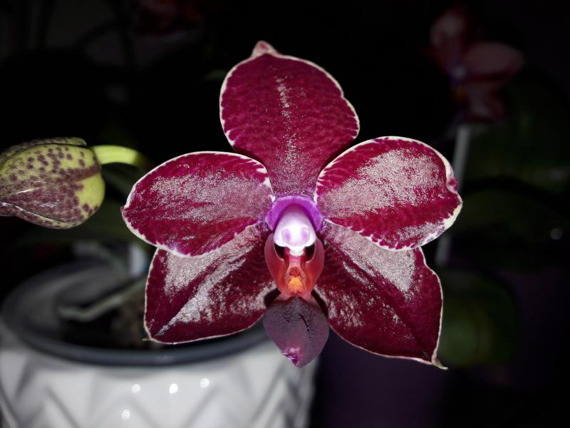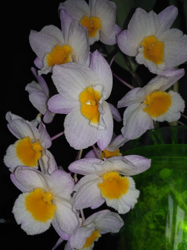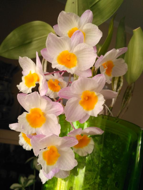 Расцвёл Den.farmeri от mikiorchid.Пришел в августе 17-го года,приличный кустик,ранее цветший,во мхе пришел.Я сдуру :girl_amaze:распотрошила мох(как делаю с фаленопсисами),обработала,посадила в среднюю орхиату+мох.Моему бедняге это ооочень не понравилось,и...он отсушил корни:girl_cray: