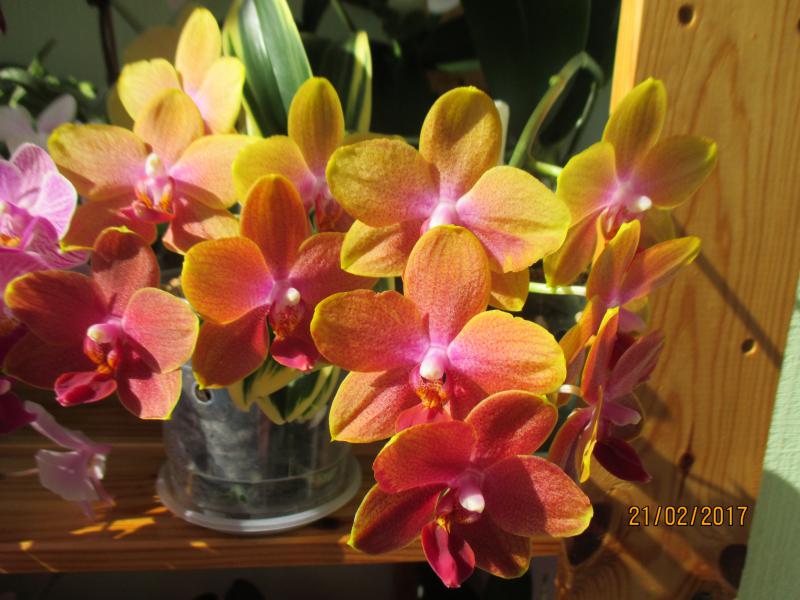 Phal. Brother Sara Gold получена от Юченг в 2016 году. В феврале 2017 зацвела довольно пышно на двух цветоносах. Цветы ее имеют приятный аромат, который слышен до полудня.