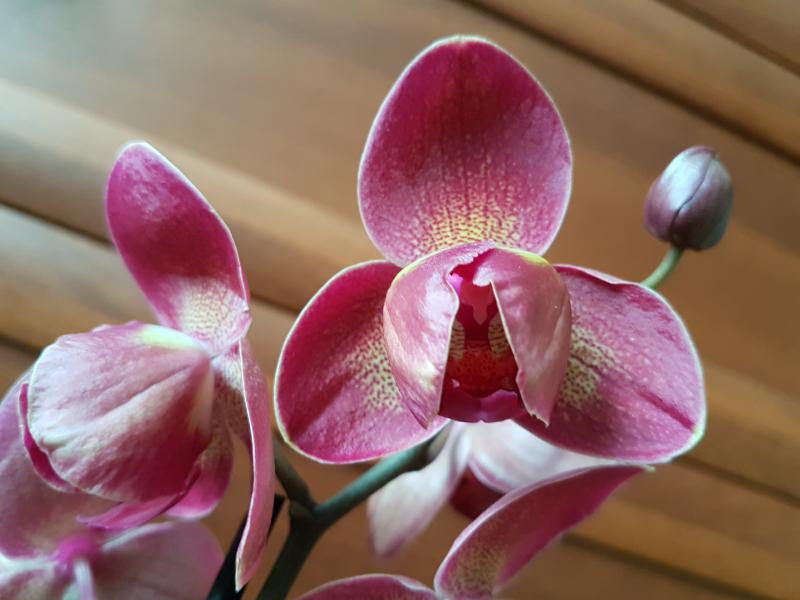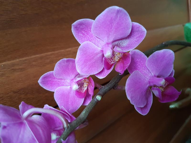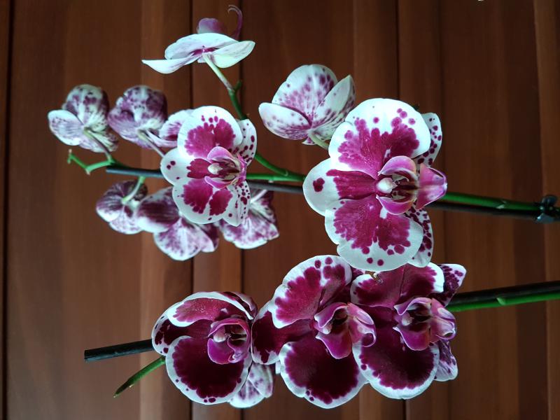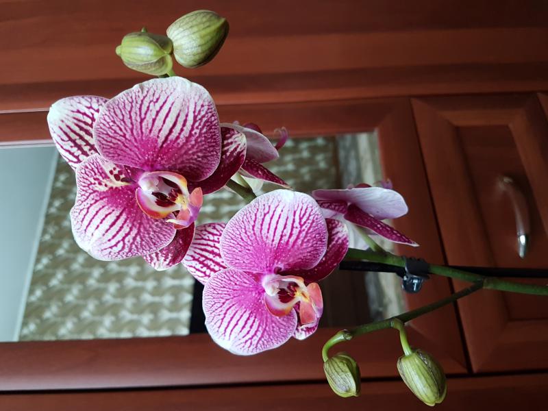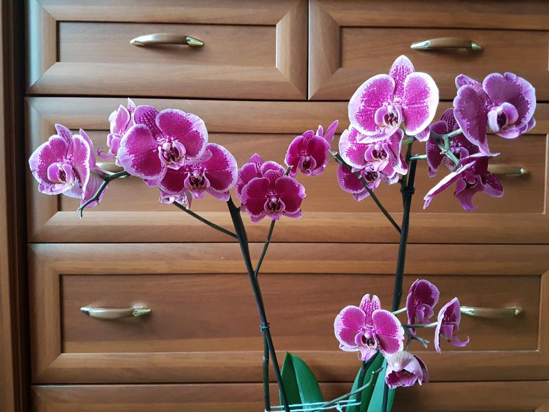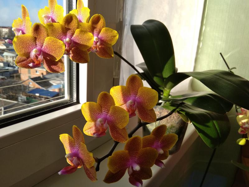 Несмотря на размеры, очень люблю этот фаленопсис, в этом году он решил отблагодарить меня двумя ветвящимися цветоносами, но, к сожалению, южные окна имеют как положительные, так и отрицательные качества. По итогу, половина бутонов "поджарились"((( оставшиеся бутоны распустились, превратившись в роскошных бабочек. Сфотографировать одновременно 2 цветоноса нереально, но и с одним цветоносом он не менее красив