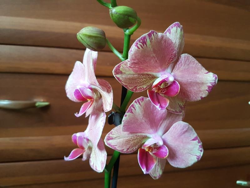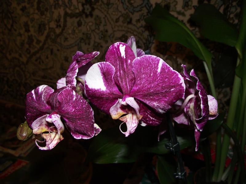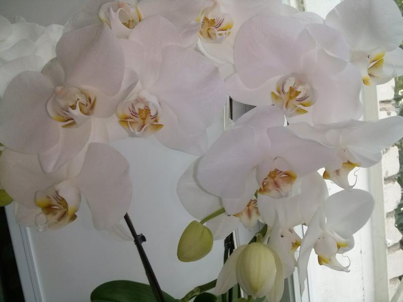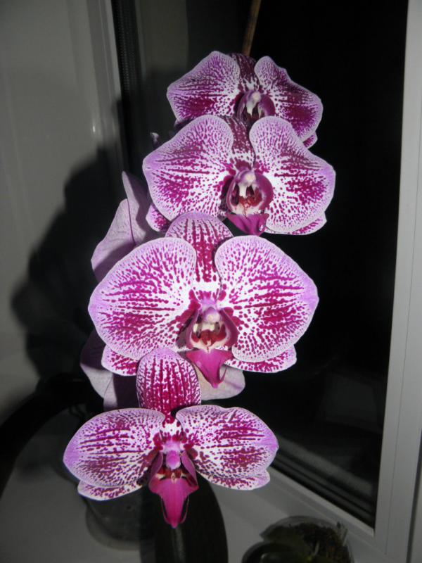 Обычный голландский гибрид..Но мой любимый. Подарок детей на мой юбилей. Цветение с 3 цветоносов,2 старых,1 новый. Порядка 40 цветов было размером 10 см. Стоят подпорки, так как тяжелые цветоносы перевешивали горшочек.