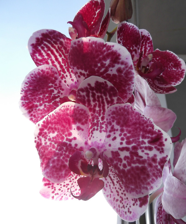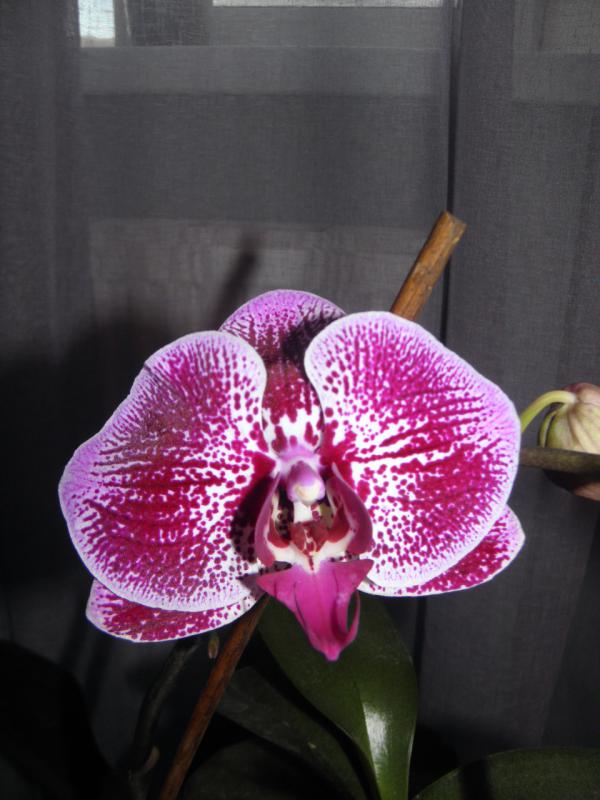 Phal. Liouline Wild Cat мощное растение с мощным цветоносом, бархатистые лепестки с чуть выпуклыми на ощупь пятнышками. На удивление, не потерял ни одного бутона, не смотря на полеты со стойки, на чью-то криворукость, на прижимание цветоноса вплотную к стеклу. Благодарный товарищ