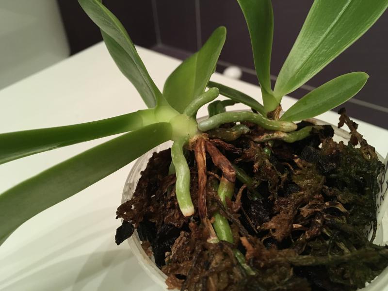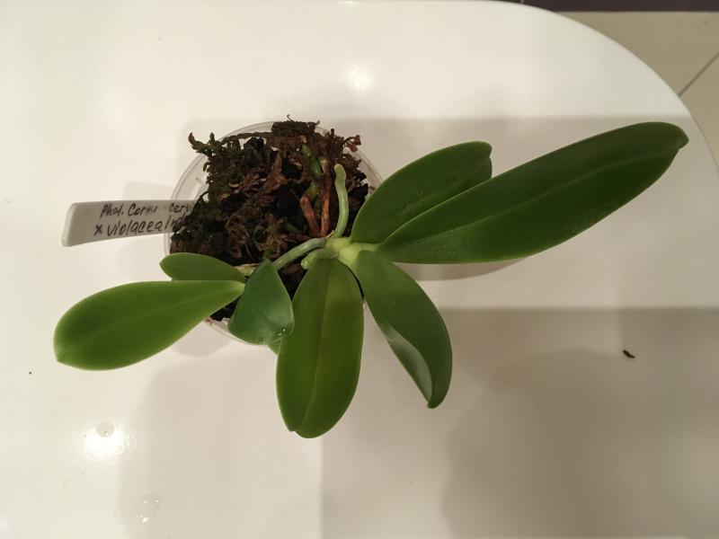 4) Phal. cornu-cervi 'red' x violacea indigo (он же Phal. Valentinii), кросс, не мериклон! пока не цвёл, но в принципе готов, выращен из фласки RW458, пора пересаживать. То, что поменьше - это не детка, а второе растение. Самый большой лист 13 см.
