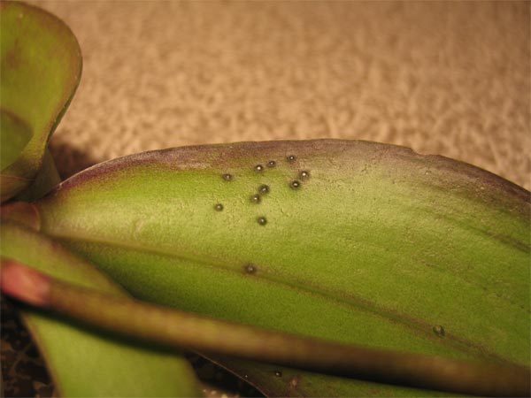 Не могу определить, что это за заболевание. Помогите, пожалуйста! :( На цветоносе распутились все бутоны, не помню сколько времени прошло, но после последнего распустившегося, через недели три, все цветы быстро загнулись, сам цветонос засох почти полностью, осталось сантиметров 15. С обратной стороны какая-то гадость высыпала. На листьях то ли налет белый, то ли нормально это, не пыль точно, потому что протираю. Пока были живы бутоны, на одном из них тоже видела похожие высыпания - в одном месте на лепестке три штуки. Да и еще: дня два назад с обратной стороны по краям листьев выступили капли, они пахли и были липкие.