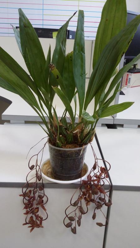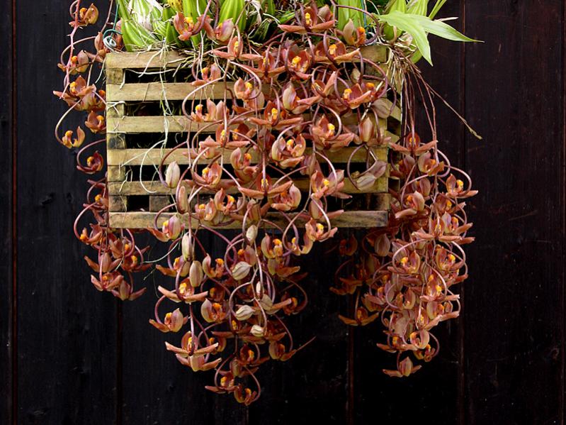 Gongora galeata - крупное взрослое растение (50 см от горшка), в этом году цвело, но, к сожалению, фото есть только начала цветения (затем уехала в отпуск), цветочных гроздей было много. Цветы очень ароматные. Третье фото цветения из сети.