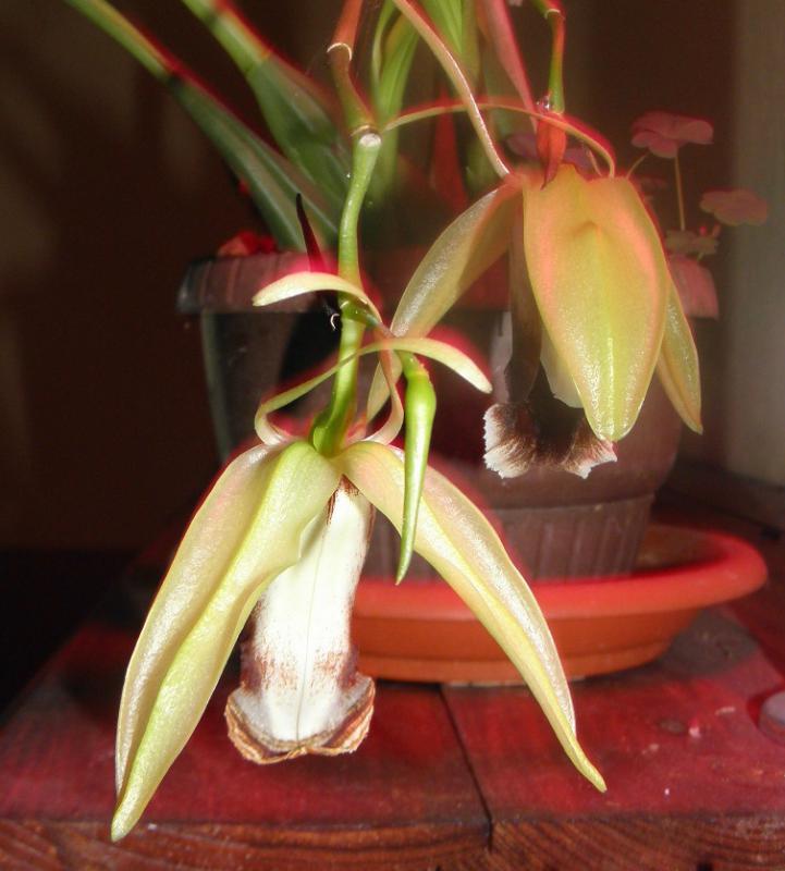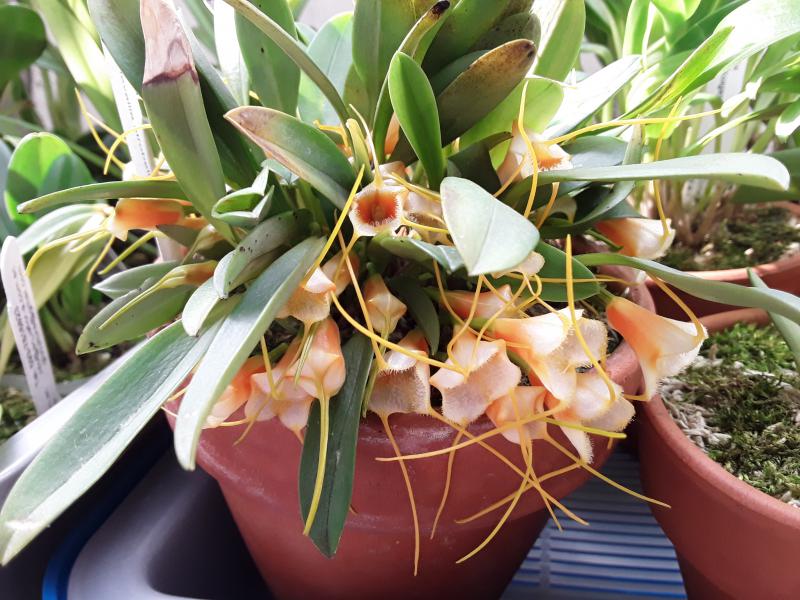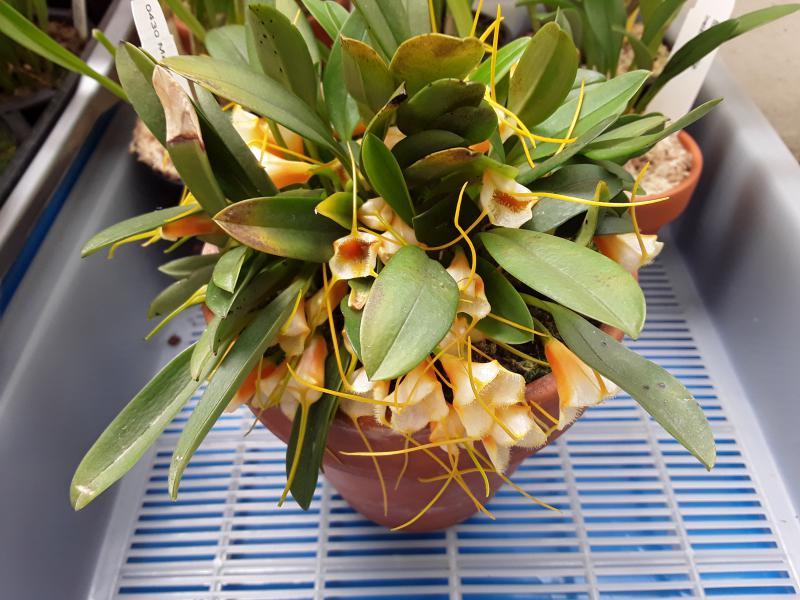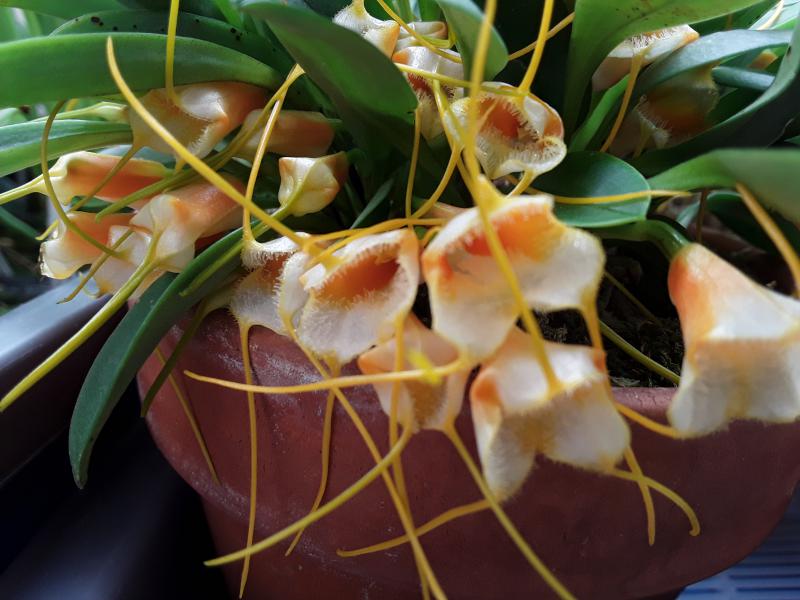 Masdevallia strobelii от Mundiflora. Получена прошлым летом крупной куртиной. Цвела в марте 2 цветочками, видимо, была репетиция)). Сейчас расцвела на всю катушку)). Цветоносы очень короткие, по 1 см, поэтому цветы плотно набиты между листьями. Цветочки не крупные, около 1 см, но компенсируется колличеством. Цветение сильно ароматное в первой половине дня. Изнутри белая часть цветка покрыта ворсинками, а оранжевая полоса - гладкая. Смотрится очень красиво, но тяжело сфотографировать, поскольку цветы смотрят вниз.