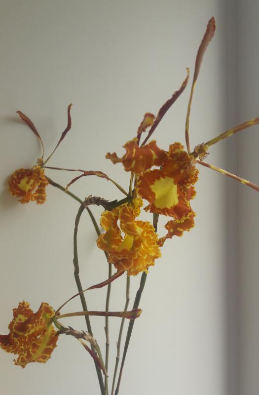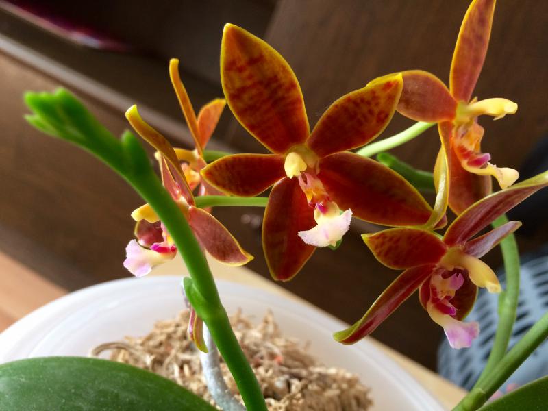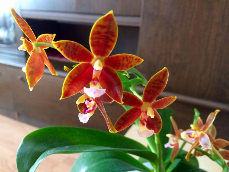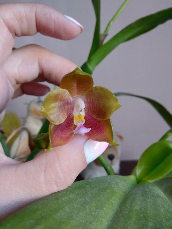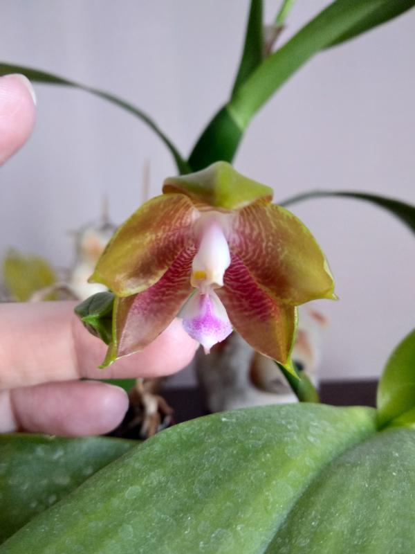 Фаленопсис Nobby's Green Eagle x P.cornu-cervi forma chattaladae. Очень ароматный. Пахнет весь день, утром на всю квартиру. Приятный аромат специй. Цветёт не переставая уже больше года. При этом растит новый цветонос и с него тоже начинает цвести.