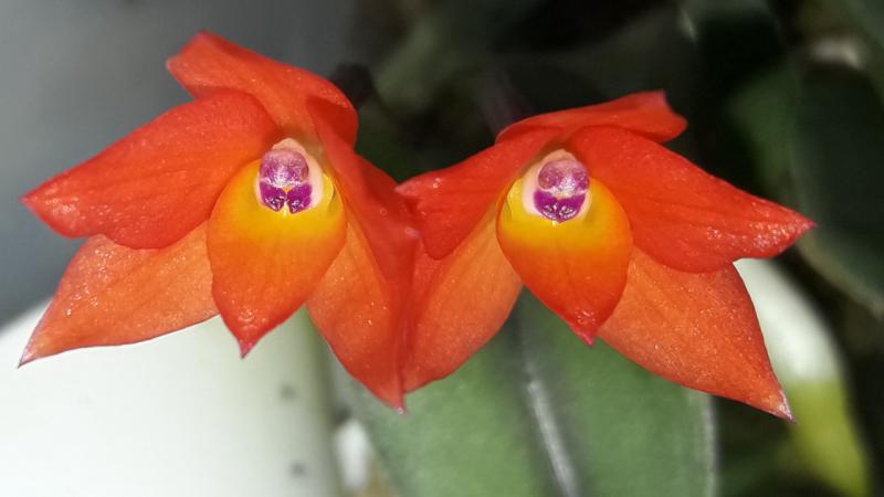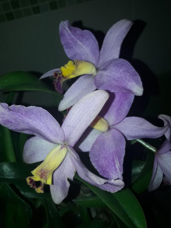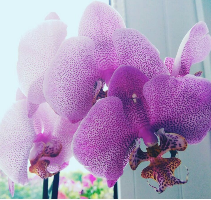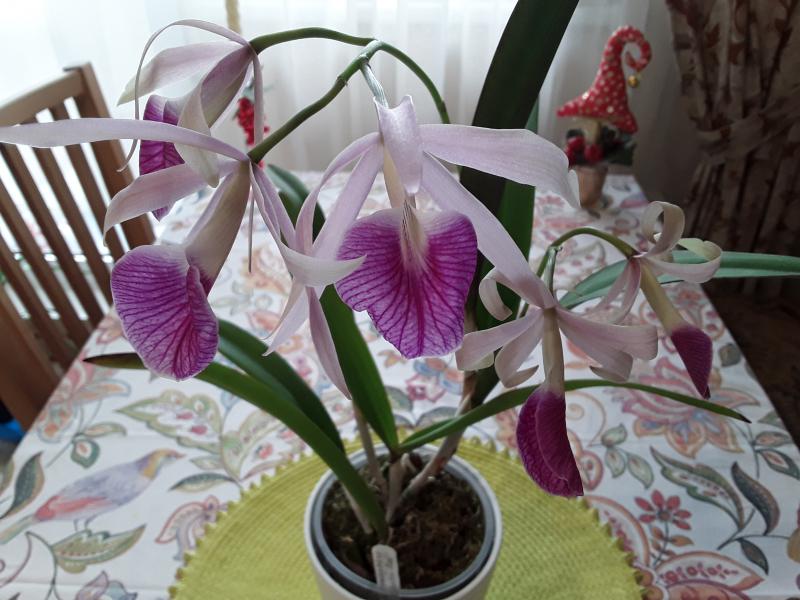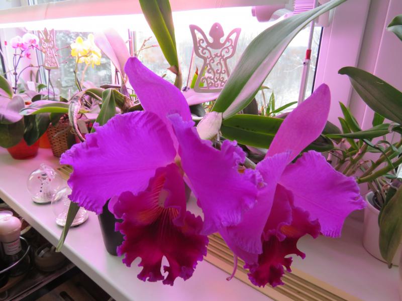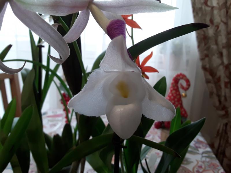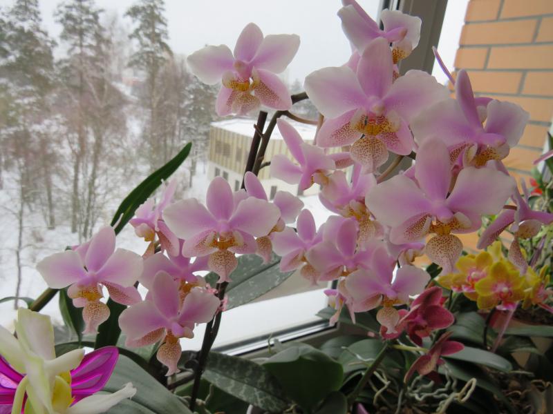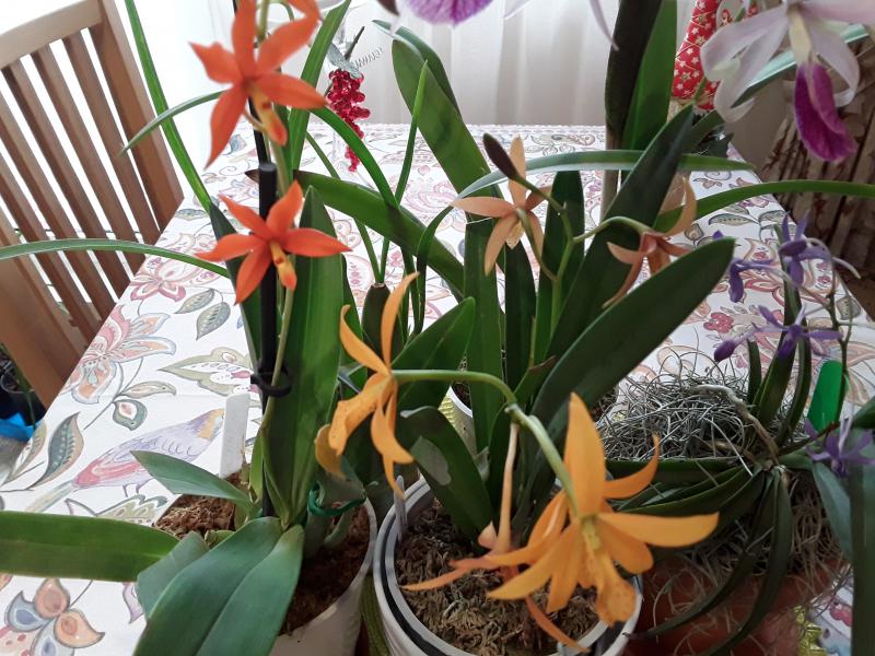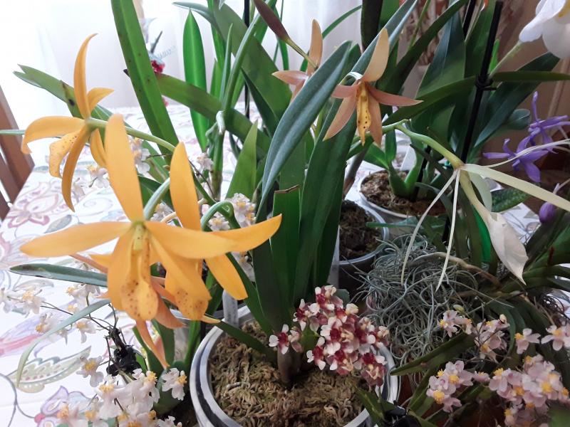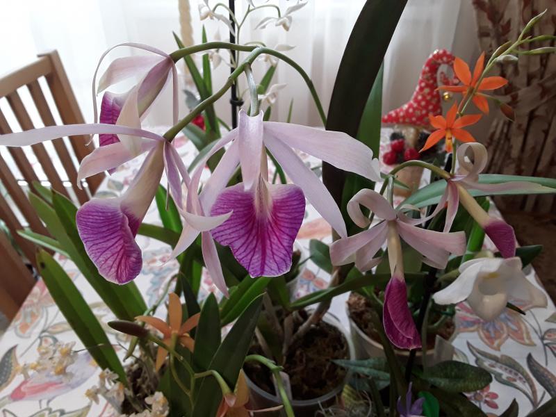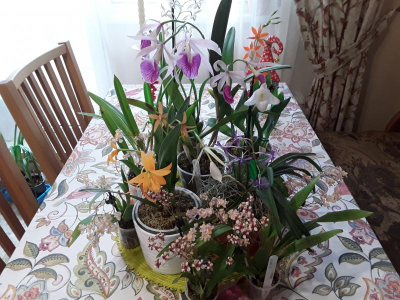 На фото: Brassocattleya Morning Glory 'Valentine Kiss' (гибрид брассоволы нодозы и лелии пурпураты), брассовола нодоза (только начала распускаться), Pvc.Golden Peacock (гибрид Brassolaelia (Brassocattleya) Richard Mueller и Prosthechea (Encyclia) vitellina), Osmoglossum pulchellum, Prosthechea (Encyclia) vitellina, 3 мини онцидиума, Neostylis Lou Sneary (гибрид Neofinetia falcata и Rhynchostylis coelestis).