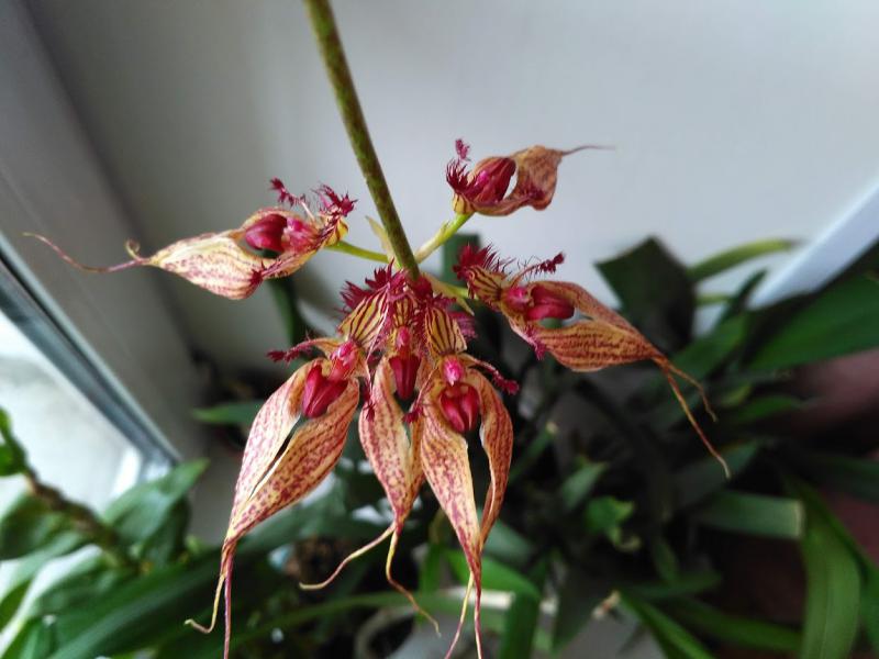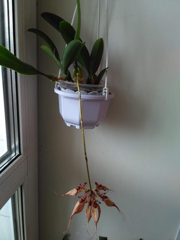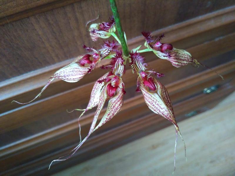 Bulbophyllum ornatissimum, с другого ресурса, живет у меня 2 года, вырос с 2х бульб. Цветет впервые. Цветы в зонтике в диаметре 15см. Пахнет неприятно, но не сильно. Если только нос в цветок засунуть.