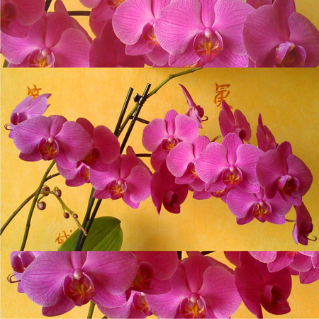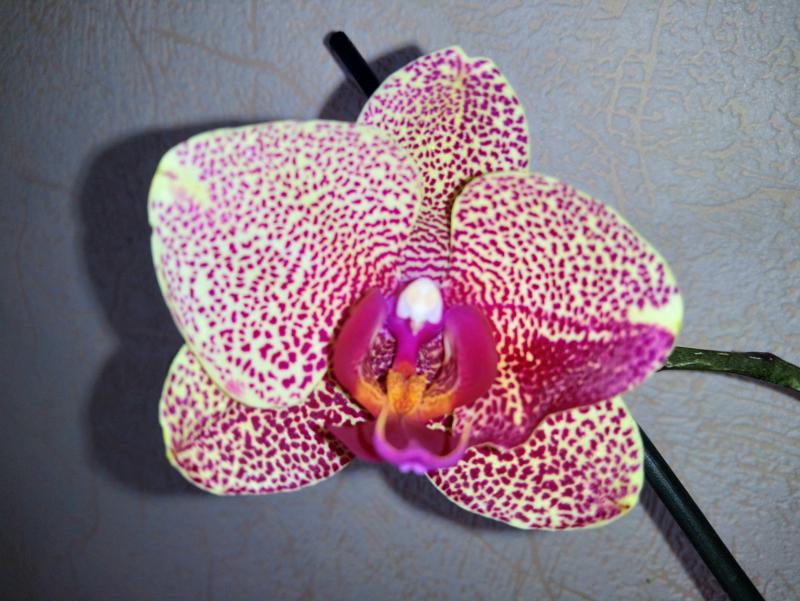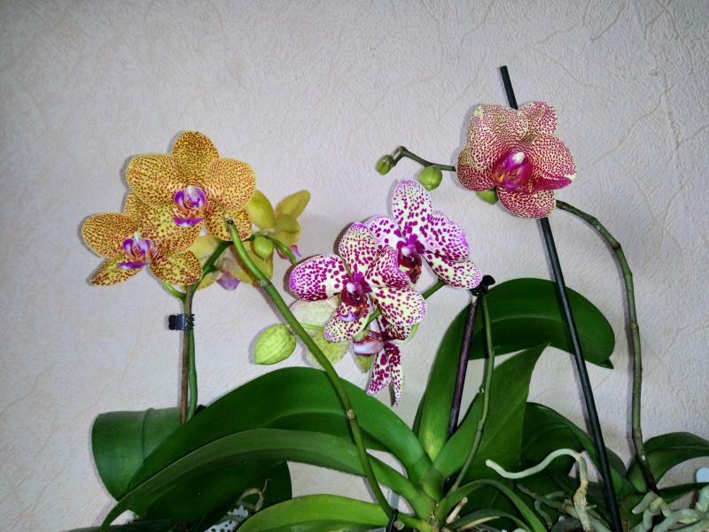 В один день с белой элегантной орхидей дома зацвела пёстрая Phalaenopsis hybrid. Словно капли туши, упавшие на бумагу, хаотично были расположены пятна на лепестках её цветков. Выглядело невероятно эффектно!