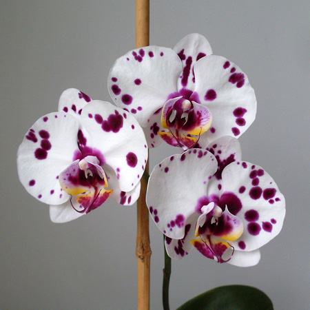 Этот далматинец приобретался для опыта: в магазине фаленопсис стояла в уценке с поврежденной точкой роста. Со временем материнское растение погибло, но оставило после себя детку, цветение которой запечатлено на фото. Эксперимент удался!