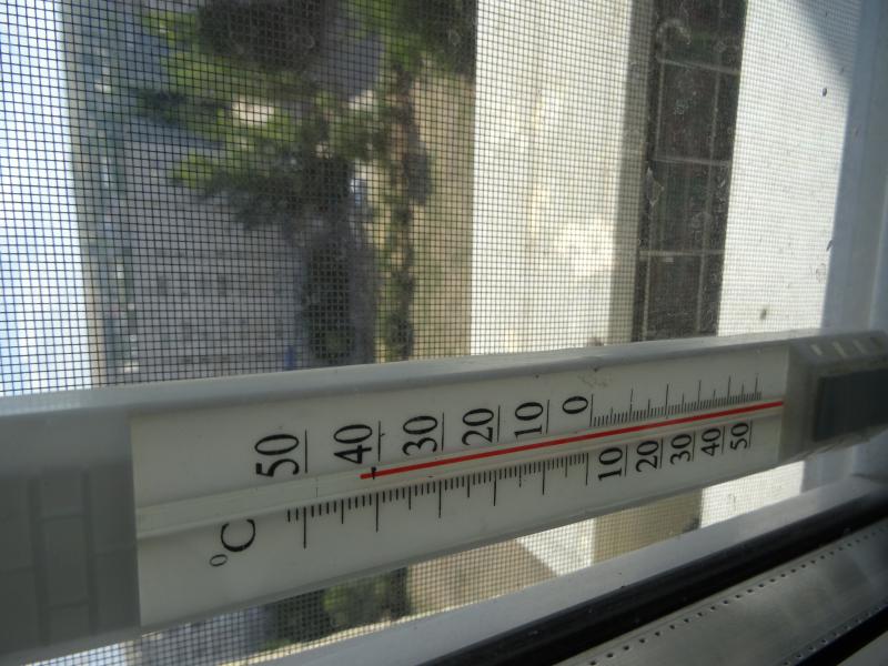 Вторая фотка, чтоб видно было, что градусник точно в тени находится и поверхность, на которой он закреплен, тоже. Более того, у нас дома прохладнее, чем на улице. А градусник на открытом немного вовнутрь окне. Так что, на улице еще жарче.