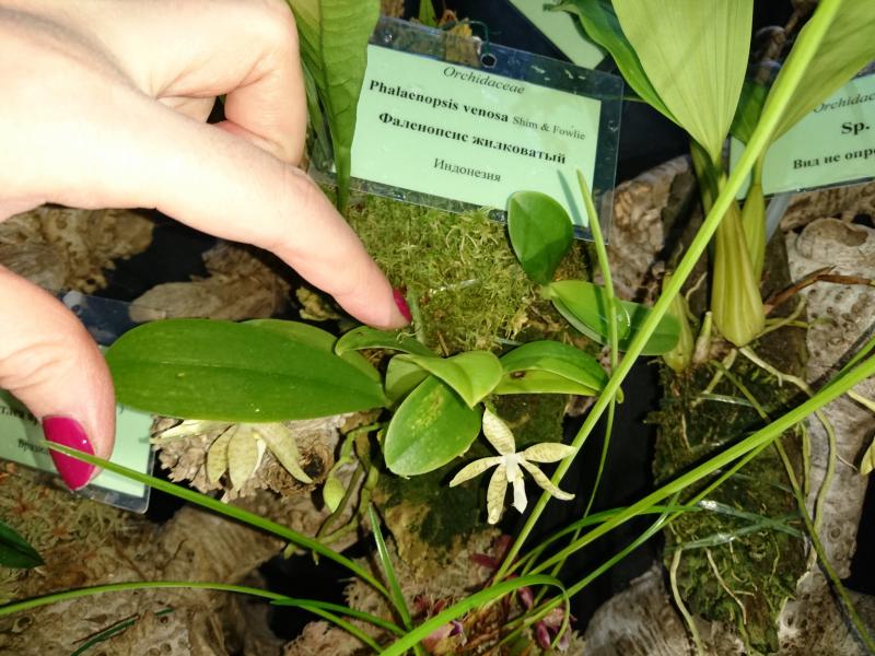 С софронитисом всё понятно. Оно софронитис и бирка его. А фаленопсиса всё же два отдельных растения. Нижнее цветущее flava, а верхнее, совсем маленькое, то, что Алла выделила верхней стрелкой, это что-то мелкое, не цветшее с биркой venosa. Чем оно вполне может быть, просто они растут на одном блоке. Так тоже может быть)