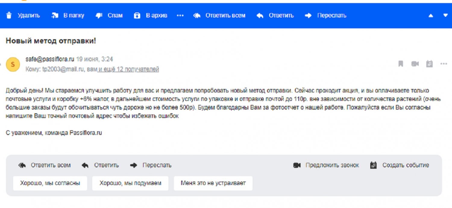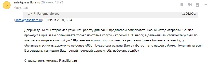 Дальше лежит отвественнность на самой почте. Фотографии каждой отправленной орхидеи были сделаны. Если вы захотите узнать какое оно ушло к вам от нас (Ну то есть какое мы положили вам в коробку) - пишите на почту safe@passiflora.ru