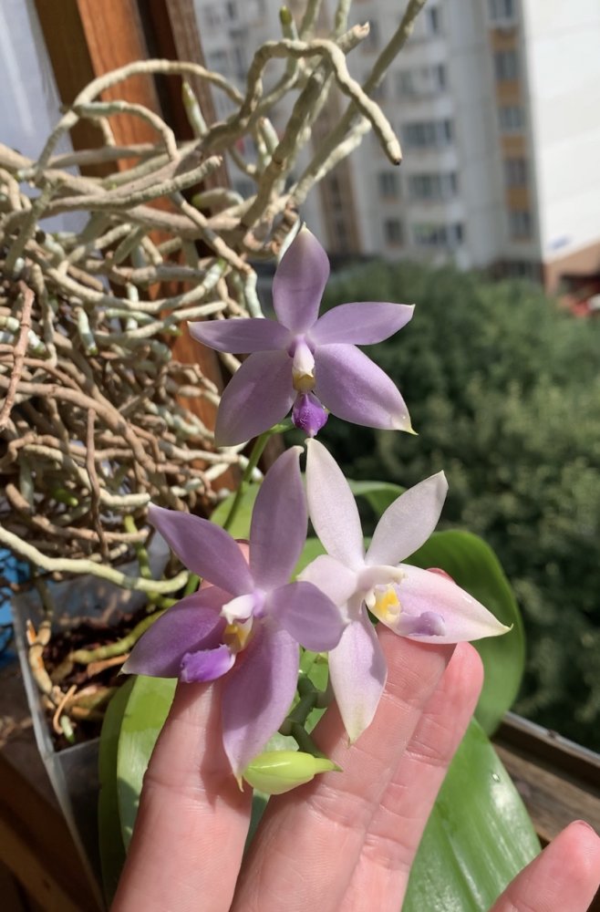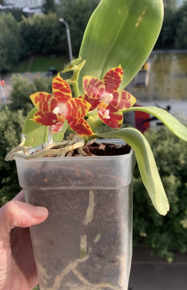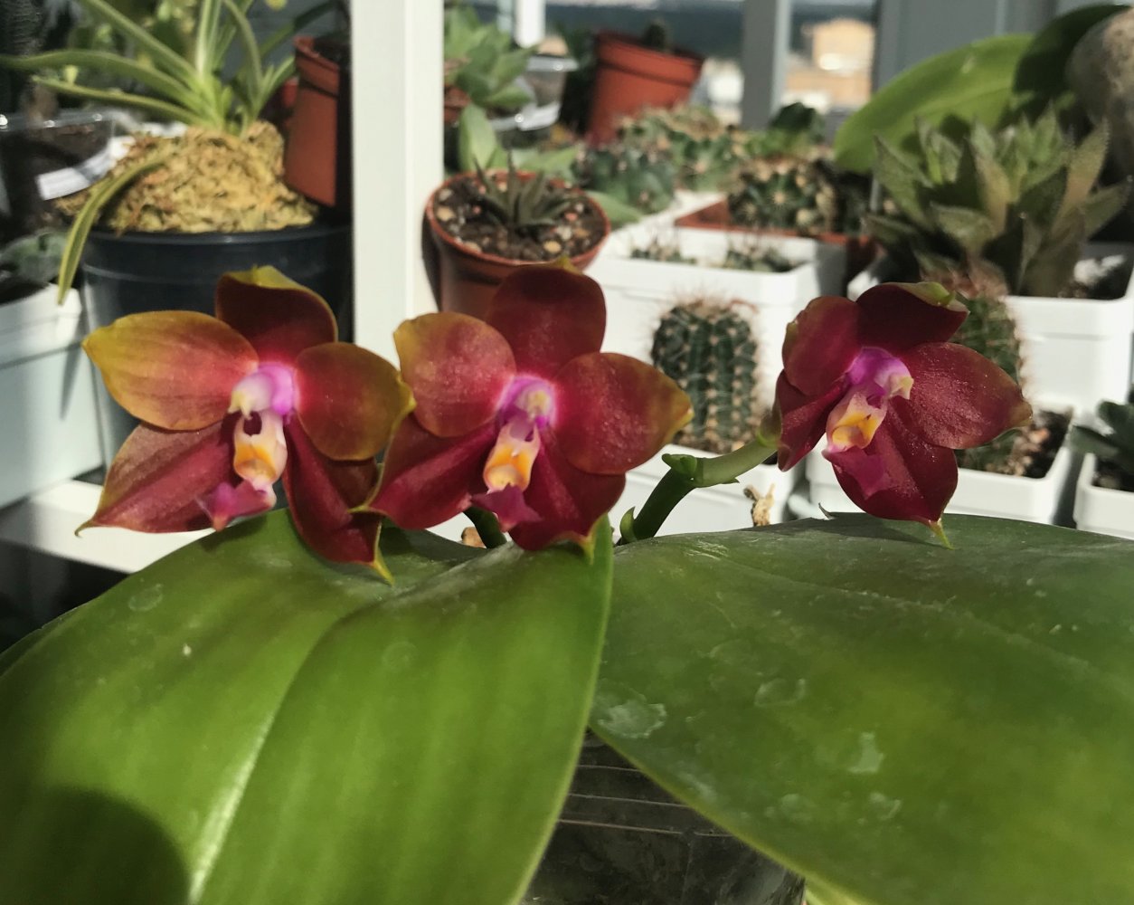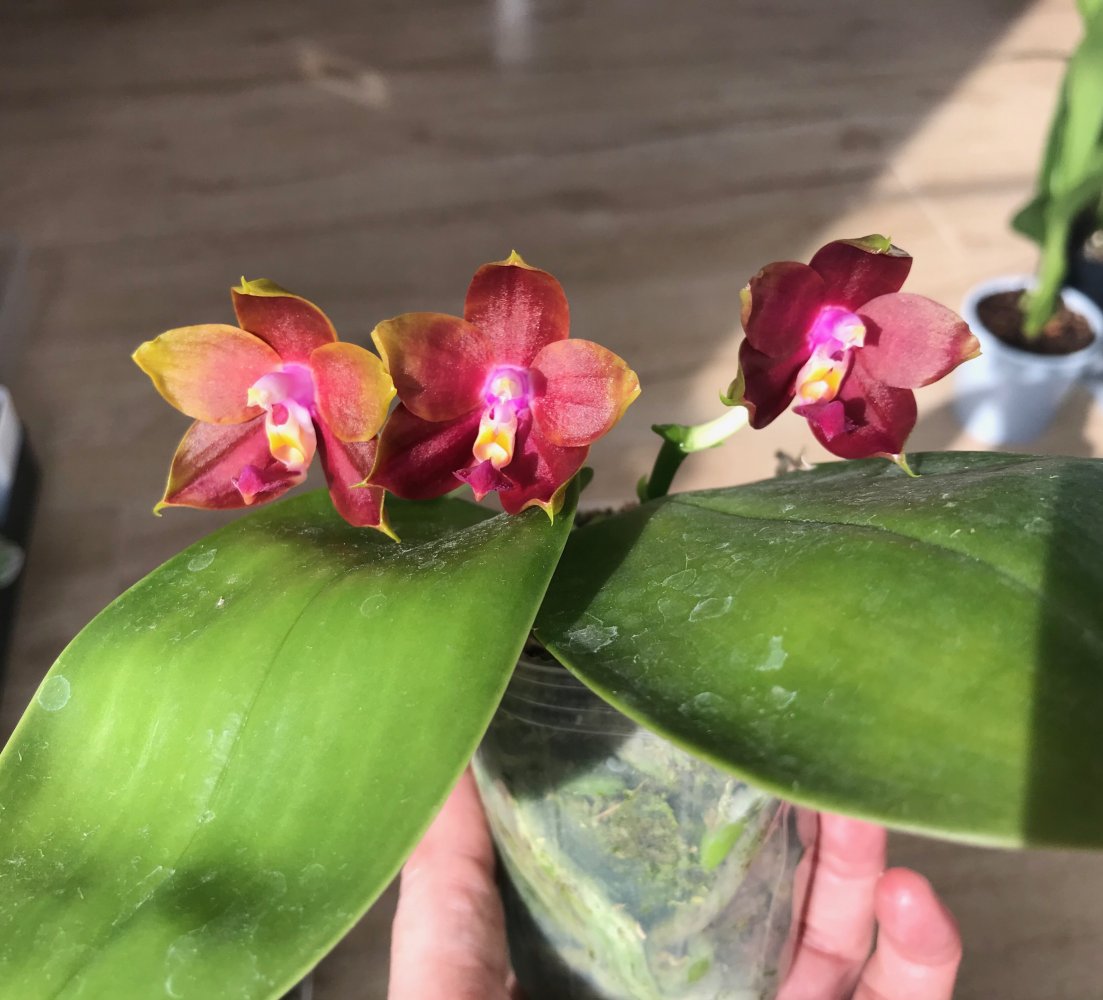 Красота нереальная ?P. Ba Shi Red Sun. Цветы большие около 7 см. Приятно пахнет. У меня два растения, оба пришли немного потрепаны, осталось по одному листу. Спустя месяц, выпустили по два цветоноса. Это раскрылись первые Цветы. Яфон.