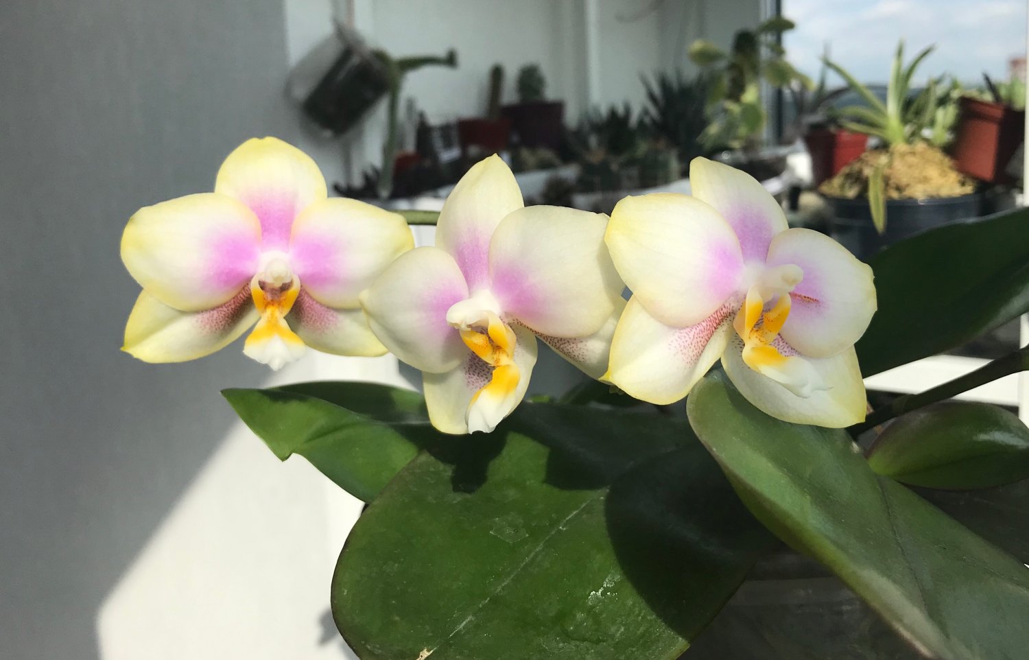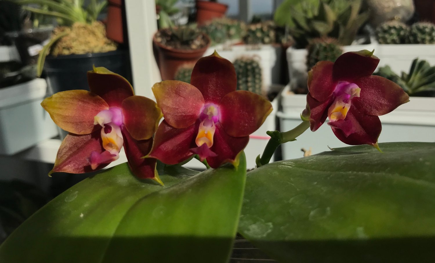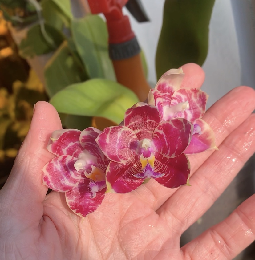 Красота нереальная ?P. Ba Shi Red Sun. Цветы большие около 7 см. Приятно пахнет. У меня два растения, оба пришли немного потрепаны, осталось по одному листу. Спустя месяц, выпустили по два цветоноса. Это раскрылись первые Цветы. Яфон.