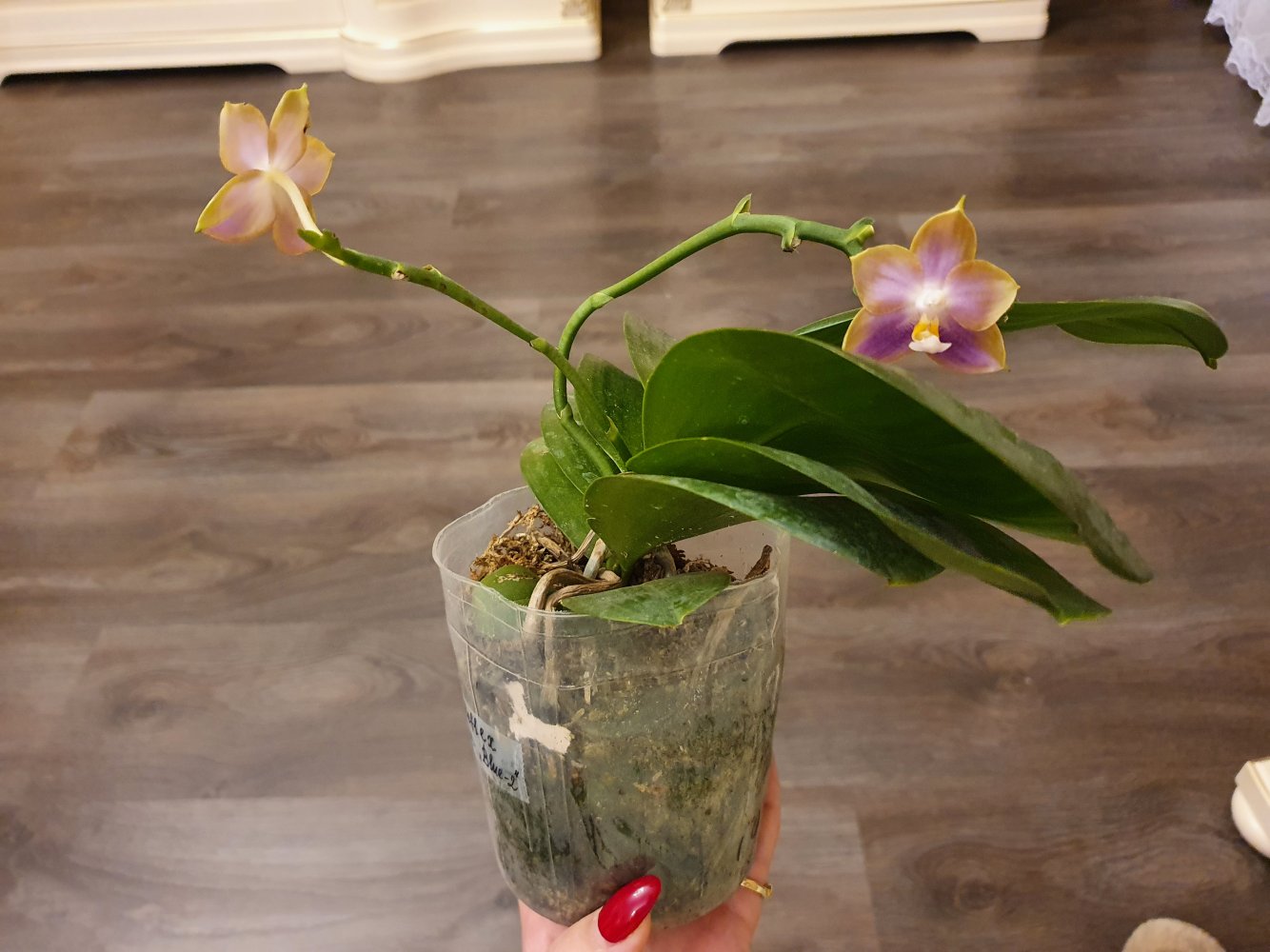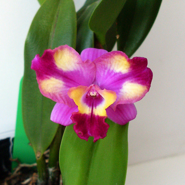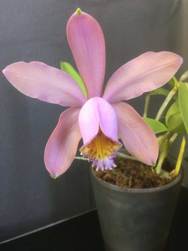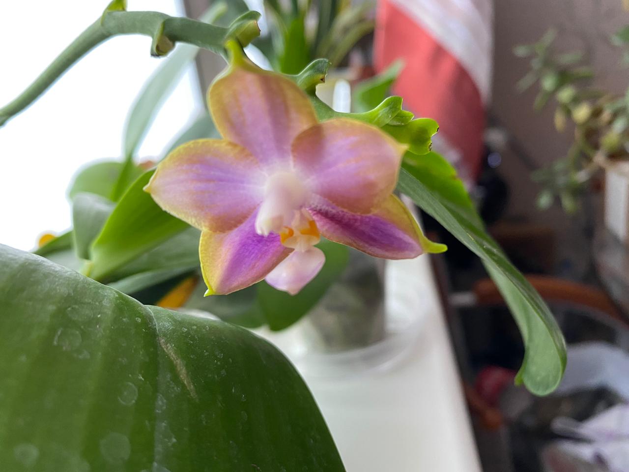 Очаровательная малышка Cattleya Hawaiian Splash ‘Lea’ вспыхнула яркими красками. Спустя полгода после получения проклюнулся цветонос. Цветение получилось скромным, и от этого, кажется, орхидея выглядела ещё милее.