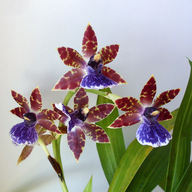 В какой-то степени и Zygopetalum hybrid побила свои рекорды: цвела уже с двух цветоносов, и цветков по сравнению с предыдущим цветением было больше чем в два раза – пять! Забавная звезда с сине-фиолетовой юбочкой! Мне нравится пятнистость её лепестков, рисунок на каждом цветке уникален и никогда не повторится. А аромат гиацинта – приятный бонус.