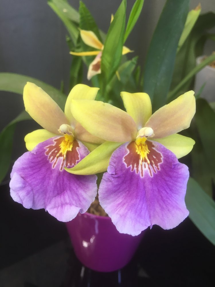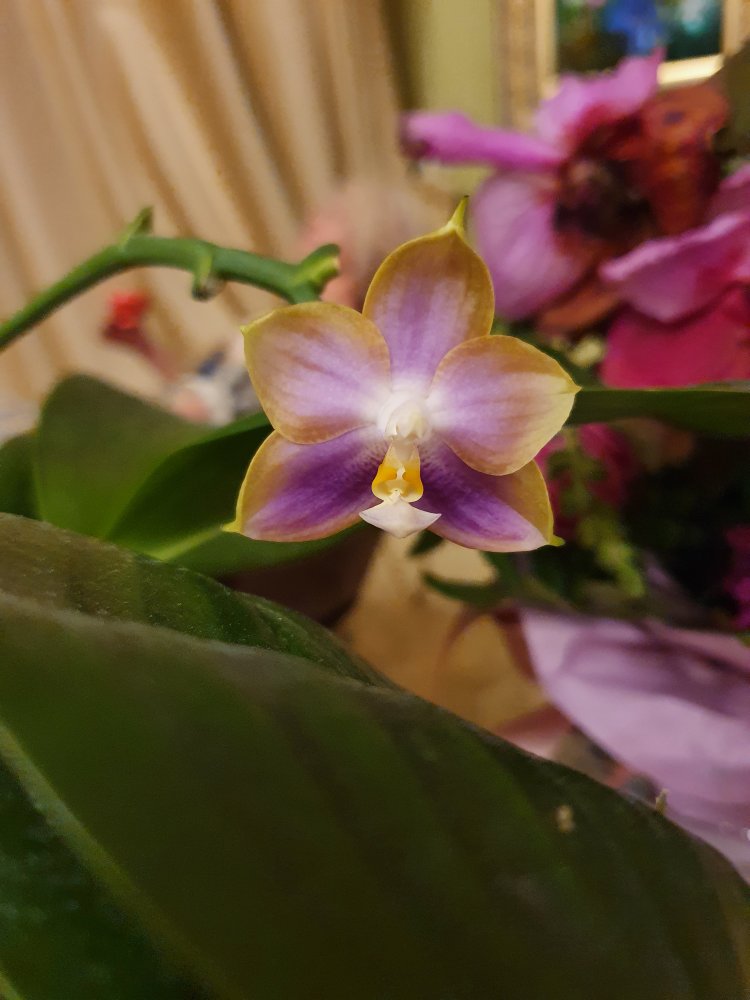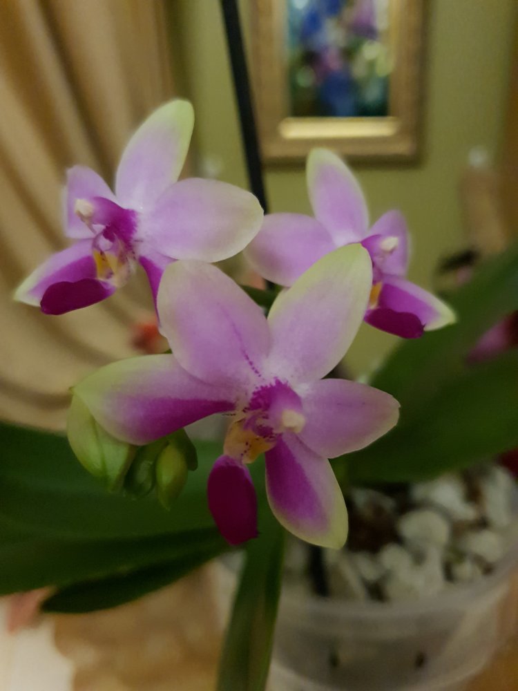 На моём подоконнике к сентябрю зацвели ароматные красавицы. Один из них Purple Martin 517. Крепкое растение с 4-мя парами листьев, есть даже детка, но остановилась в росте и корней не даёт. Цветонос хоть и не длинный 18-20 см, рос медленно. Первое цветение. После раскрытия первого цветочка из чешуйки ранее цветка появился отросток, но он пока не определился кем хочет быть, скорее всего бутоном. Цветы не крупные, 4 см, плотные, окрас от светло-зеленоватого к пурпурному, прям неоновый какой-то оттенок. Губа у цветка потрясающего цвета и объёмная, а не плоская, капелька. Цветок ароматный, чем-то напоминает сирень, но с терпкими нотками. Пахнет в течение светового дня и к ночи почти не ощущается. Запах улавливается только в пределах 30 см от цветка. Не приторный. 3 цветка распустила, 1 бутон и ещё 1 дует и похоже это не предел, пока наблюдаю 👀.