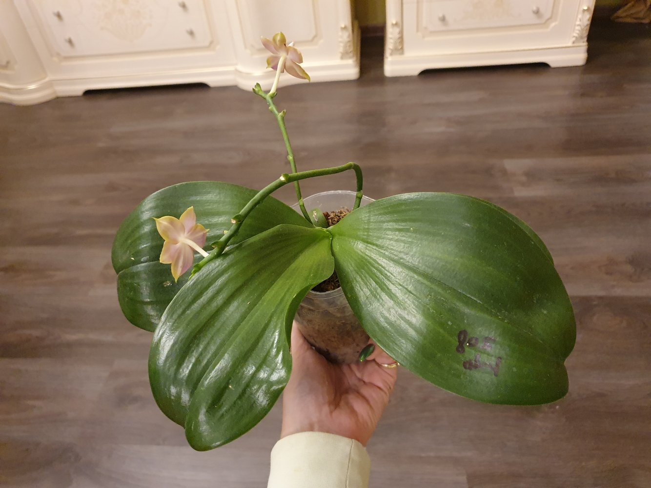 Цветоносы не длинные, опору не требуют, 1-й - 11 см., второй длиннее, измерить нельзя немного загнулся. Самые большие 2 верхних листа 16-17 см и в ширину 10 см. Цветы плотные, восковые 4 см., поверхность атласная и переливчатая. После цветения не сушит цветоносы, а доращивает. Очень вкусно пахнет, приятно не навязчиво, сладкий (но не притарный) и остаточное остренькое послевкусие. Запах ни на какой из мне знакомых не похож. Пахнет постоянно в любое время суток даже тёмное. "Не на всю квартиру" Но если подойти к подоконнику, то чувствуется лёгкий аромат.