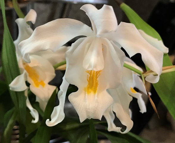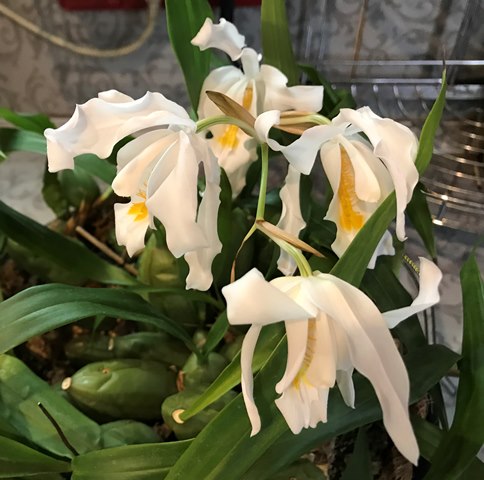 Coelogyne cristata покупала в Ботсаде в размере 4 бульб 13.02.2015, за это время набрала массу,разрослась, уже не раз делила и опять выпрыгивает из гошка. На подходе еще 4 цветоноса. Эта ароматная, белоснежная красавица на мой взгляд должна быть в каждой коллекции, цветок крупный. Главное в момент роста(весна-лето) хорошо кормить, не давать просыхать и осенью устроить хорошую просушку после вызревания бульб.(2 месяца без полива)