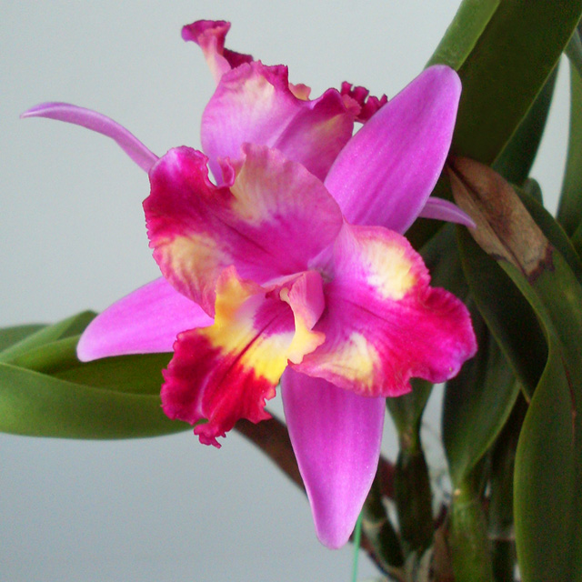 Cattleya hybrid хоть и вырастила две псевдобульбы, процвела только с одной. Второй туберидий получился худым и слабым, оттого и неспособным на цветение. Нужно сделать выводы и исправить погрешности ухода. Ну а то что расцвело, достойно для любования. Рюши на губе приводят меня в восторг!