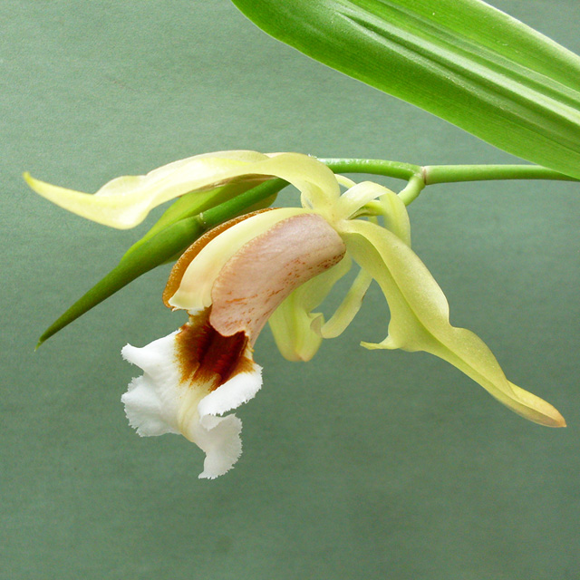 Как и в прошлый раз, Coelogyne Orchideengarten Sabine зацвела повторно спустя пять месяцев. Широкие волнистые и узкие закручивающиеся лепестки нежного цвета мякоти лайма, контрастная окрашенная хной губа с изысканной бахромой и густыми ресницами, неповторимый приятный аромат будто цветочная пыль – всё в этой орхидее прекрасно! Да ещё растёт и цветёт полностью под искусственным светом! Молодец!