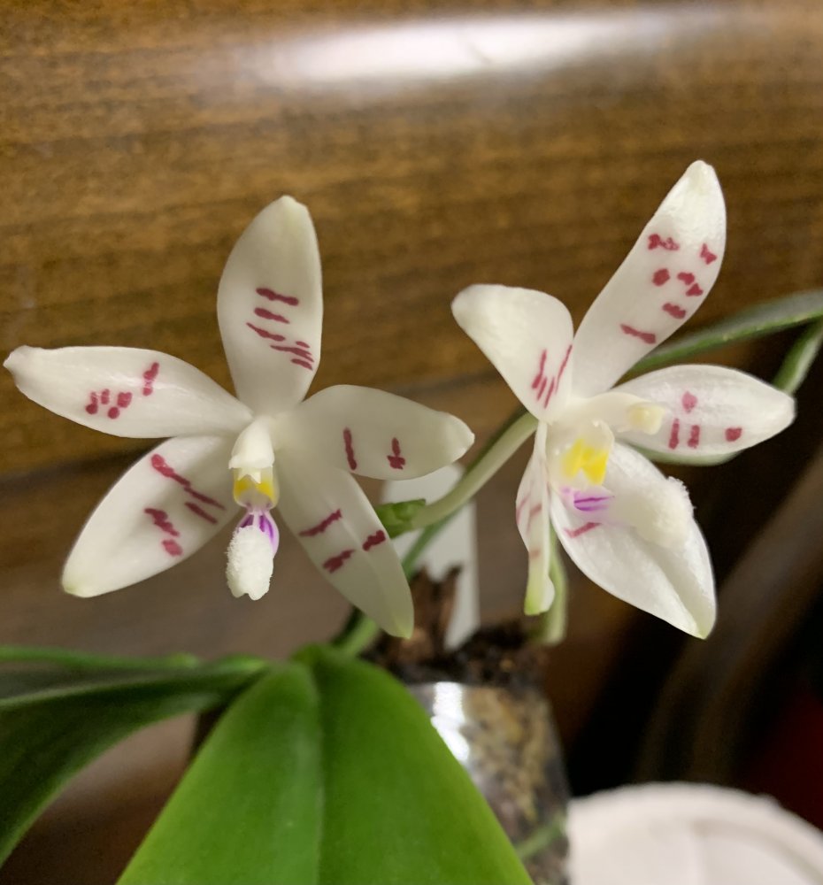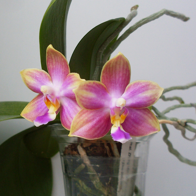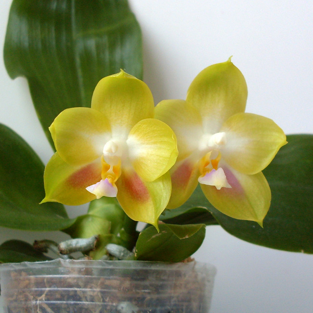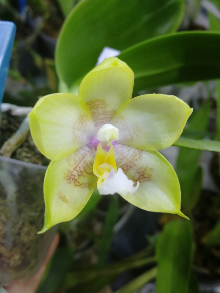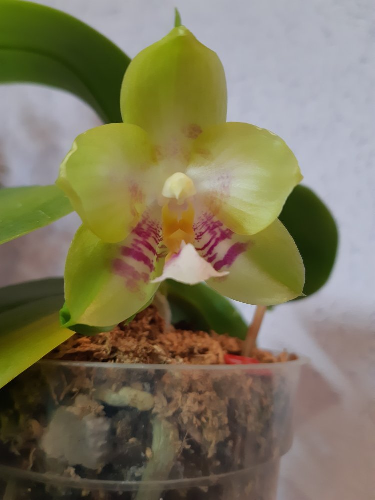 Phalaenopsis Zheng Min Colorization цвела впервые! Получил её осенью 2018 г., растение пришло в горшочке 5 см, в который было высажено на ферме годом ранее; через десять месяцев проклюнулся цветонос, через пять открылся первый цветок. От посадки до цветения орхидее потребовалось два года и четыре месяца.