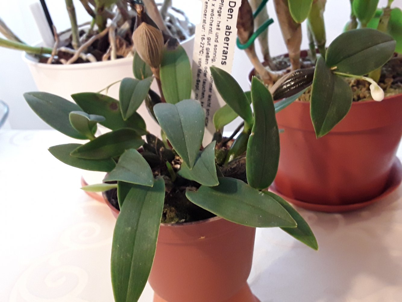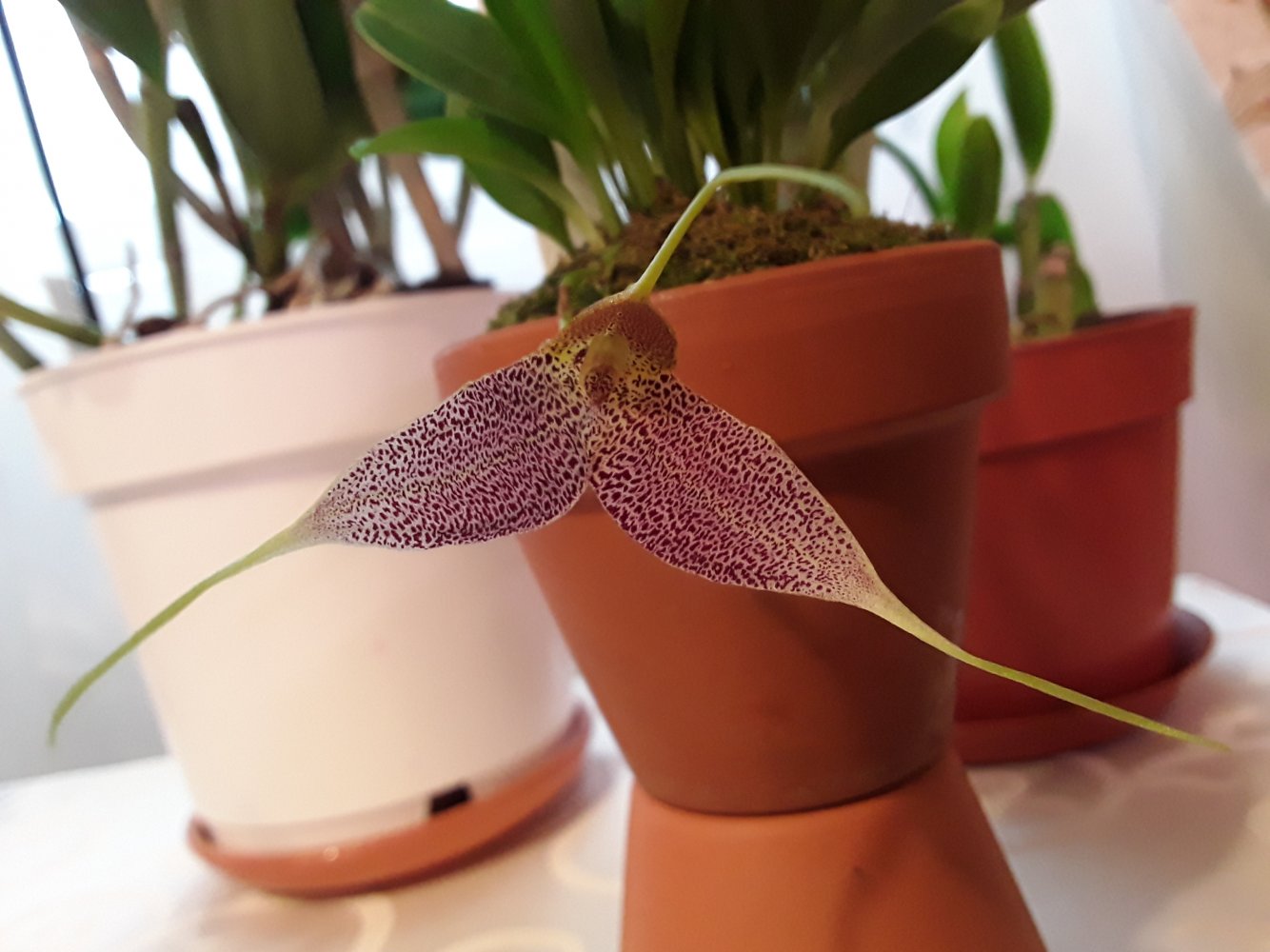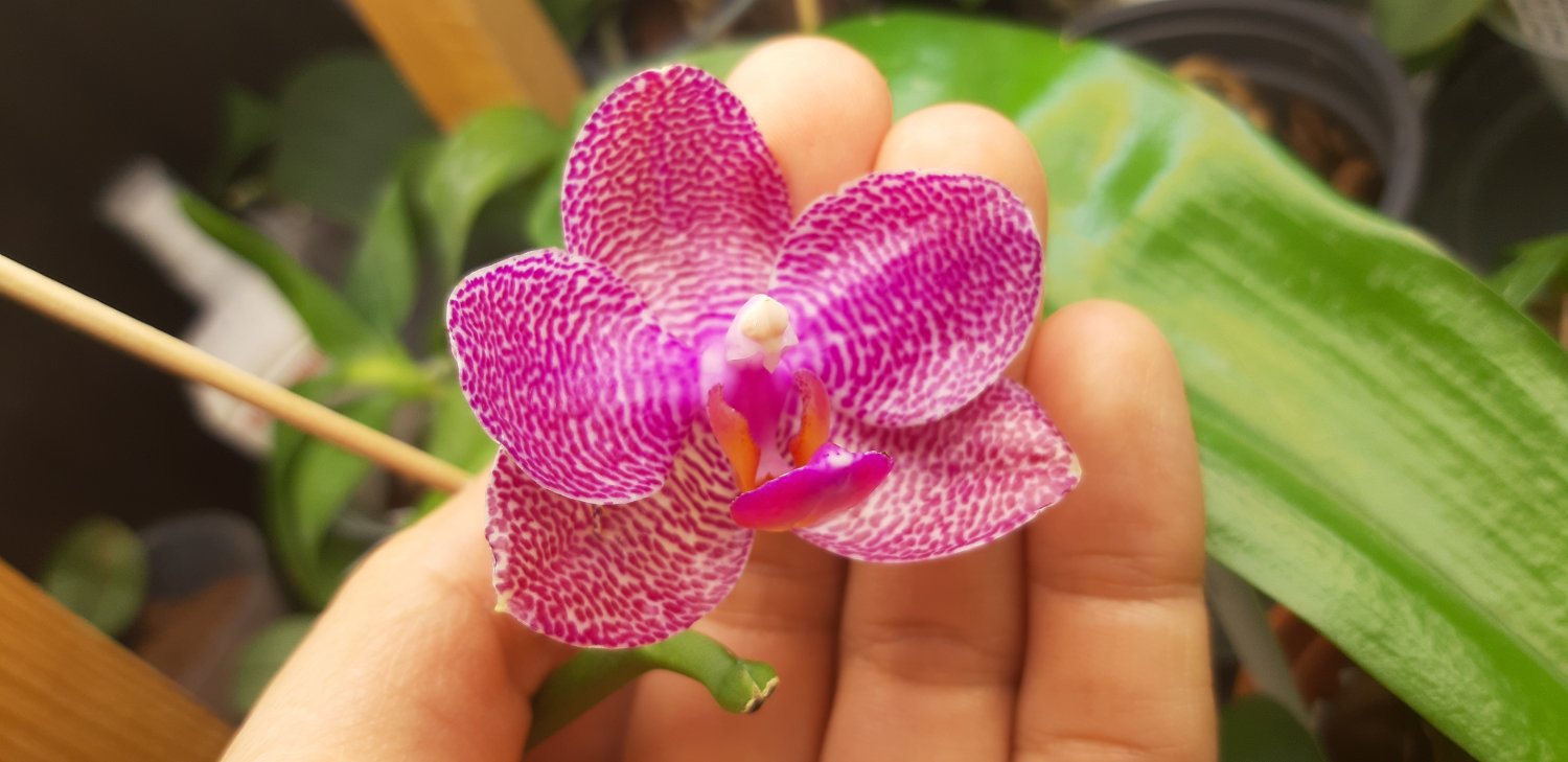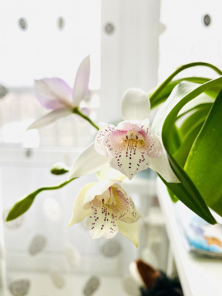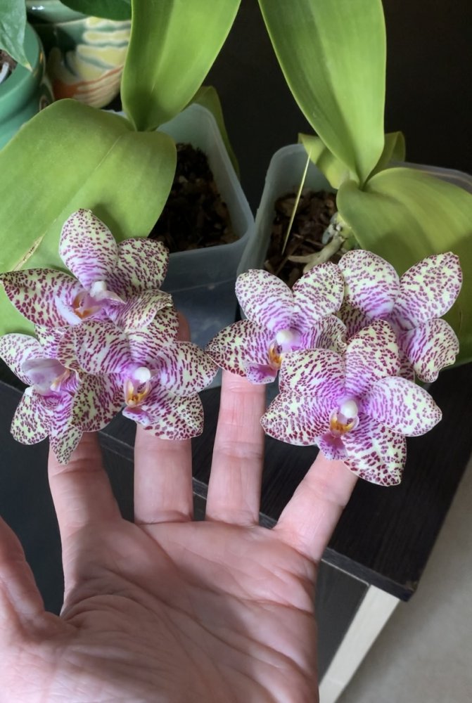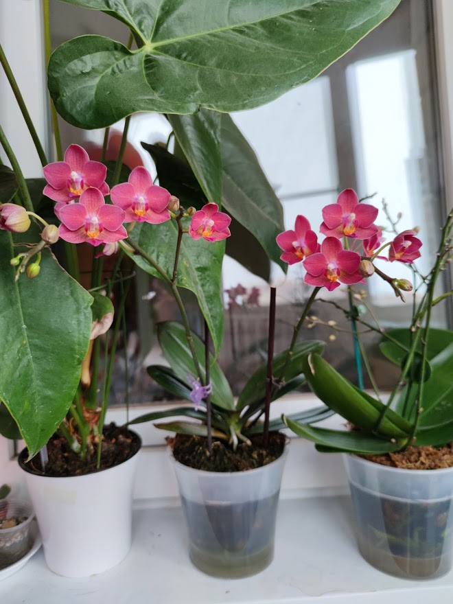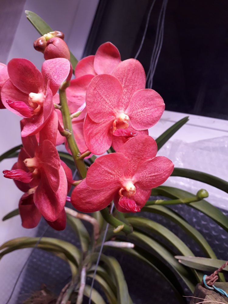 Приятные, нежные цветы, более светлые, чем на фото. Очень задорные крапушки. Но цветы на цветоносе поникающие, смотрят все вних, пришлось фотографировать снизу.20201121_213930.jpgasc Dr. Vanek.Радует в этом сезоне уже в третий раз. Сейчас растит и второй цветонос( на фото справа). Жалко, что не сразу двумя процветет на этот раз, а по очереди. Цветы у нее не такие крупные, как у ванд, но люблю ее за чистый алый цвет.20201121_214132.jpgv. Similan Pink, первое цветение, чистый розовый цвет20201121_213953.jpgИ вот двухцветная красавица, тоже цветет двумя цветоносами. Название потеряла, но если порыться, найти можно.